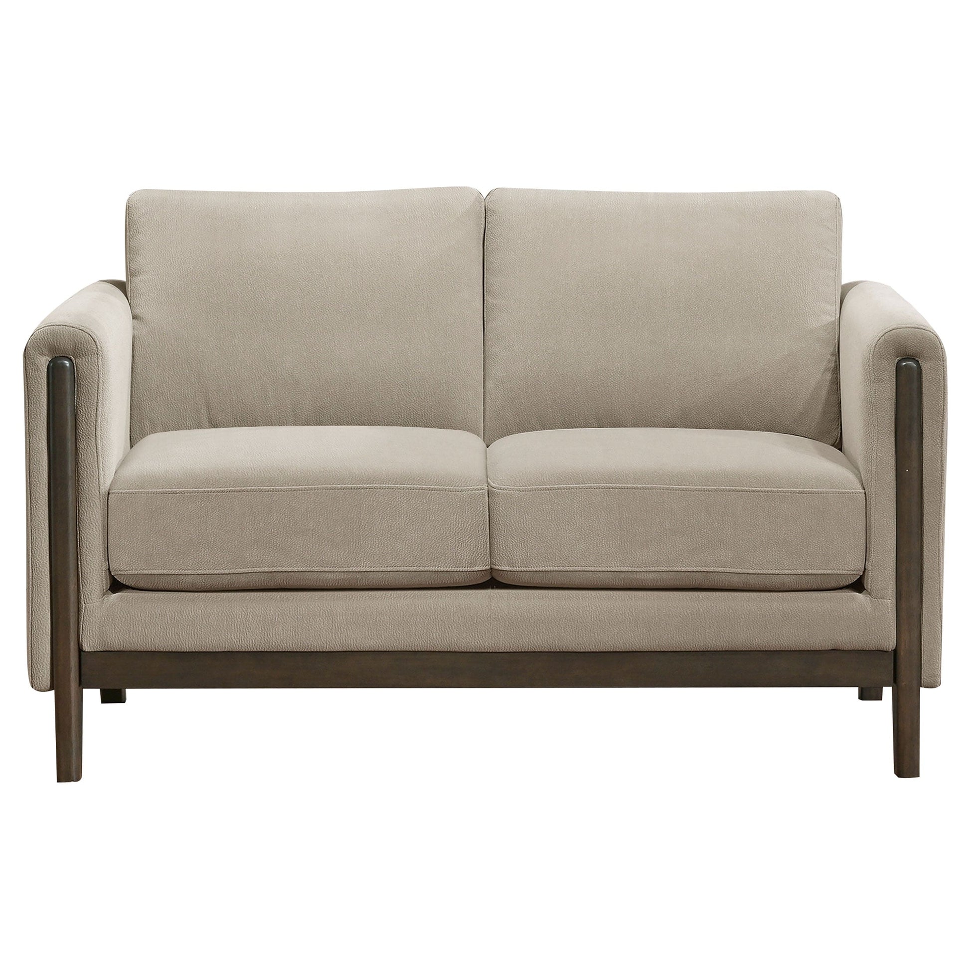 Modern lines and plush comfort come together in this upholstered loveseat, designed for relaxed refinement. A engineered wood frame in a rich coffee finish outlines its recessed panel arms, creating a clean, architectural silhouette. Wrapped in taupe polyester, the seat and back cushions are fully reversible for extended use and lasting comfort. Whether styled alone or with its matching counterparts, this piece offers balance and softness in equal measure.