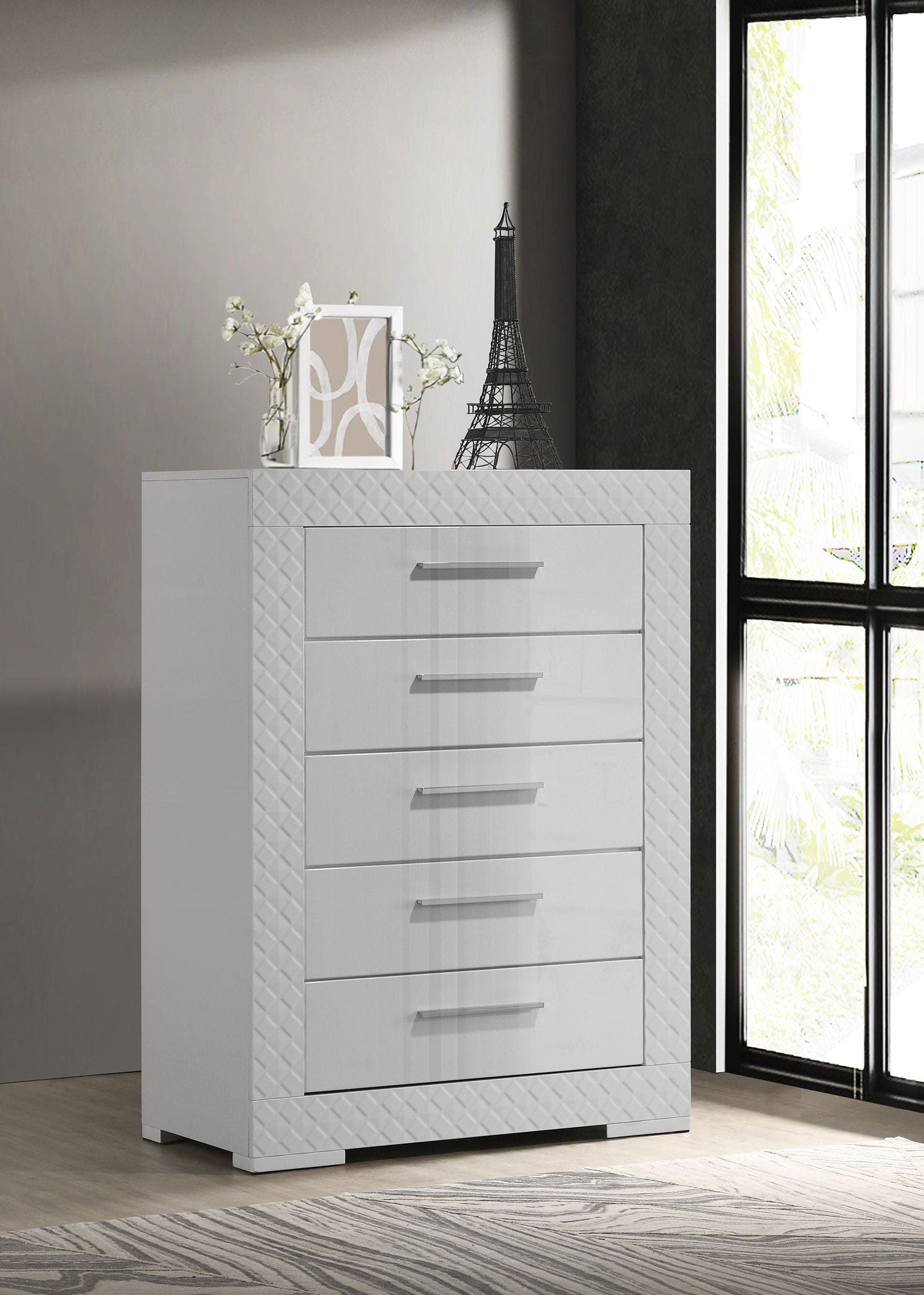 Organize your wardrobe in style with this contemporary chest. The high gloss finish and 3-dimensional diamond tile emboss provide a chic, modern look that enhances any bedroom decor. Five spacious drawers offer ample storage for clothing and linens, each with felt lining in the top drawers to protect your delicate items. The chest is built with robust materials and Pin construction joinery, ensuring durability and smooth functionality. This piece is both practical and stylish, perfect for a modern home.