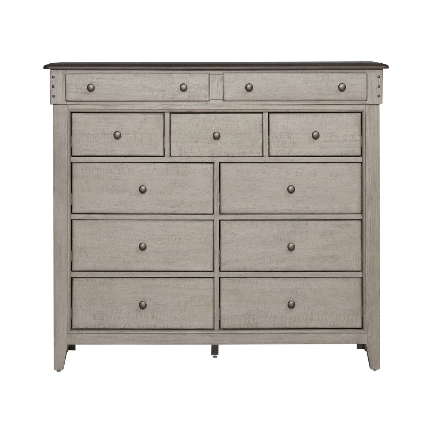Live life beautifully with the Ivy Hollow dresser. Crafted of poplar solids with pine and alder veneers, this piece features dusty taupe tops with a weathered linen base that is heavily distressed with saw marks. This chesser offers eleven full extension drawers with premium felt lined top and cedar lined bottom drawers. The top drawers are offset for added dimension which flow into tapered feet. Framed end panels create a nice side view. Pin nail accents and antique pewter knob hardware add character to the front of the case. Inviting and inspirational, Ivy Hollow offers a look and design style that works for cottage or contemporary and is more about creating a look that we love.