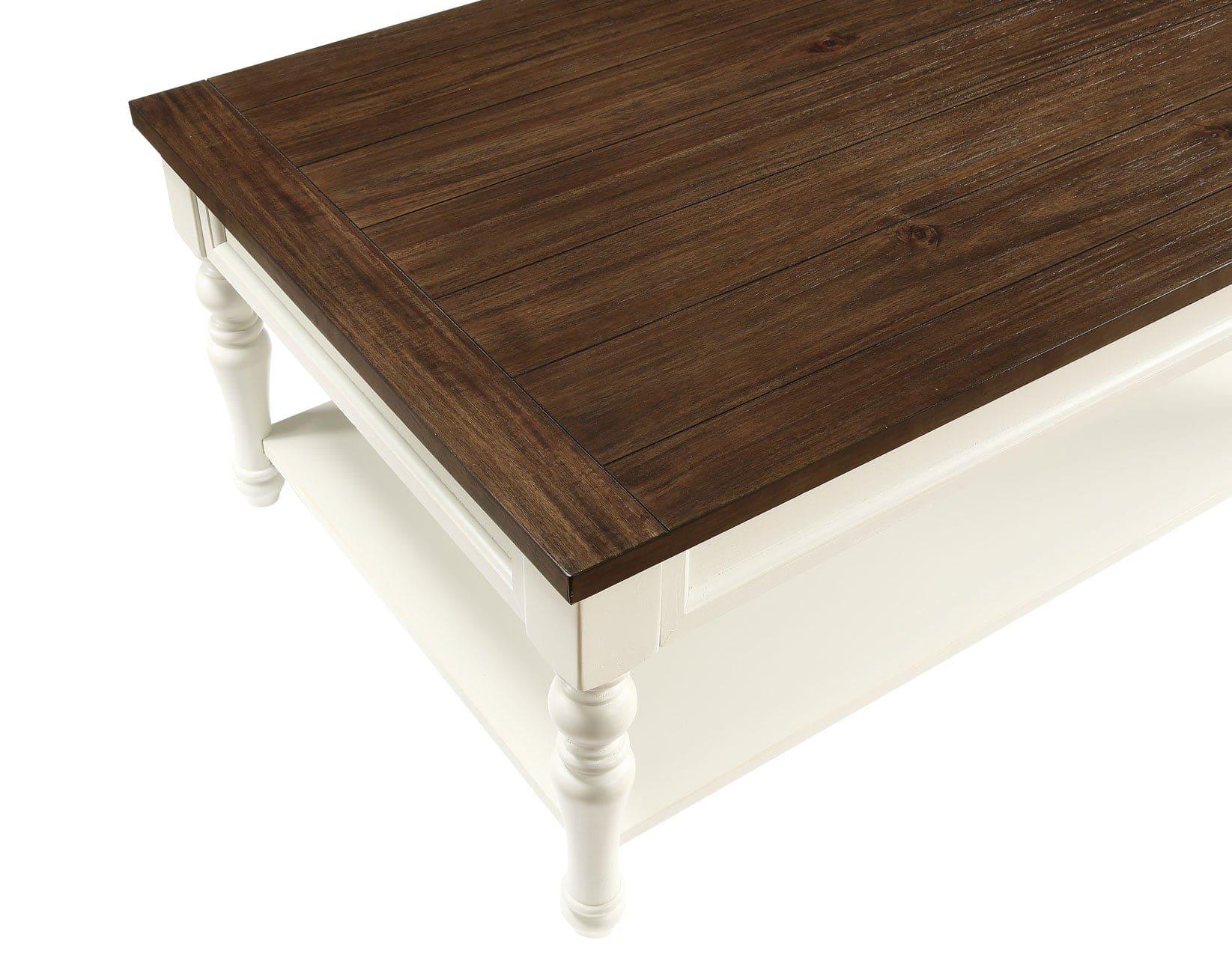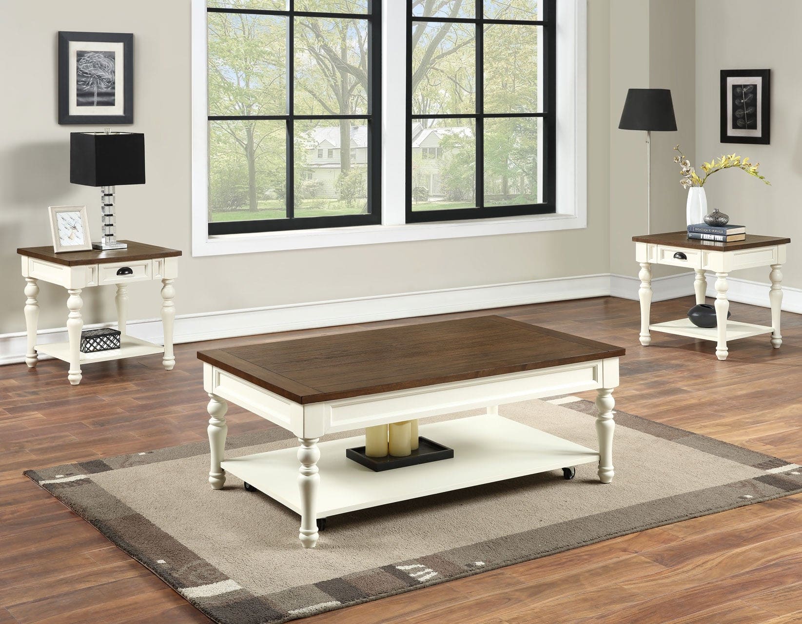 Add farmhouse charm to your living area with the Joanna Occasional set. Gracefully turned legs combine with a two-tone ivory and mocha finish for an inviting look that works well with any farmhouse or cottage upholstery. Casters add real function to the Coffee Table and the bottom shelf adds storage and/or display area while also adding structural stability to the unit. Matching Sofa Bar and dining sets are available to create a unified living/dining area look.