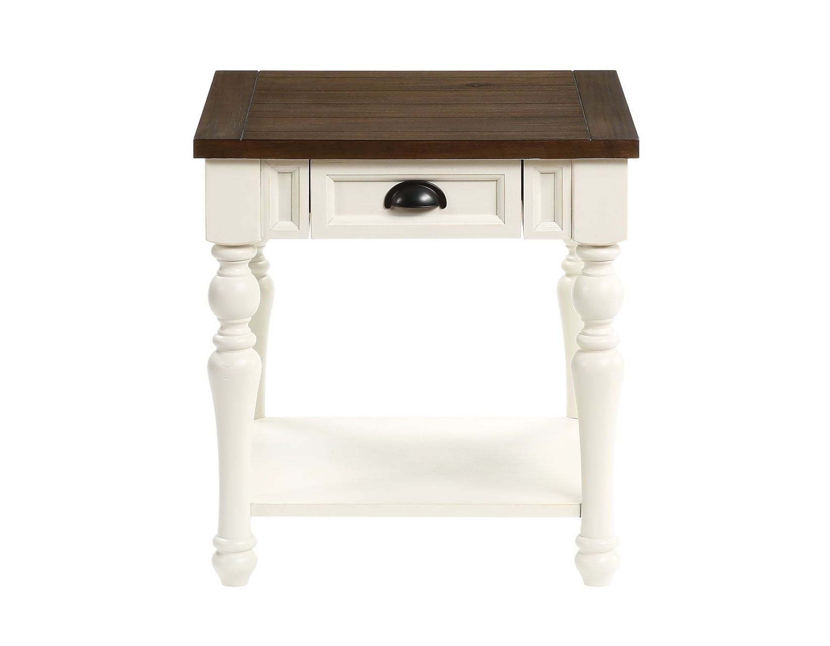 Add farmhouse charm to your living area with the Joanna End Table. Gracefully turned legs combine with a two-tone ivory and mocha finish for an inviting look that works well with any farmhouse or cottage upholstery. A working drawers with half-moon nickel hardware adds hidden storage to any room while the units’s bottom shelf adds storage and/or display area while adding structural stability. Matching Sofa Bar and dining sets are available from this comprehensive farmhouse collection.