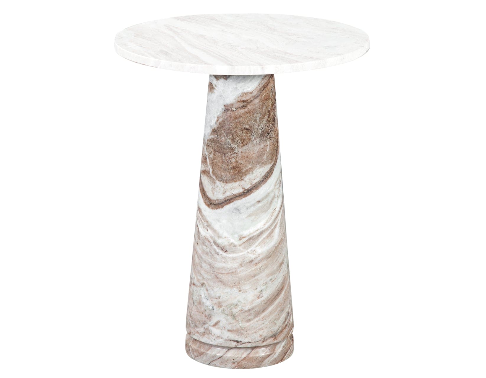 The Joni Accent Table blends natural elegance with sculptural design. Featuring an 18-inch round Toronto Brown marble top and a graceful teardrop marble base, each table is uniquely veined with rich brown tones and soft white or tan accents. Mined and hand-finished, no two are exactly alike. Perfect beside a chair or as a nightstand, Joni brings warmth, refinement, and organic texture to any space. A true statement piece, this accent table showcases timeless style and the enduring beauty of natural stone.