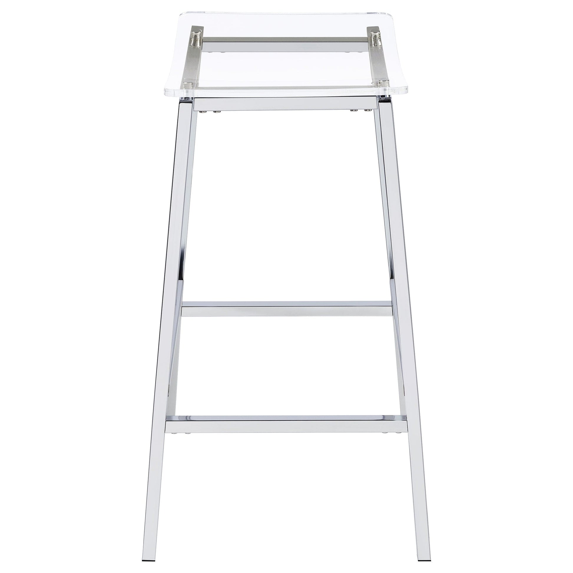 Updated to reflect the carefree contemporary style you crave, this set of two bar stools uses modern materials and finishes to bring a crisp look. Perfect for casual seating at a bar table or counter, these stools are lightweight yet sturdy. Gleaming chrome finish metal framing includes a two-bar seat support and built-in footrests. A gently curved seat made of acrylic reveals the nuts and bolts of metal framing. Add this bar stool set to your easy-living space for entertaining and family meals.