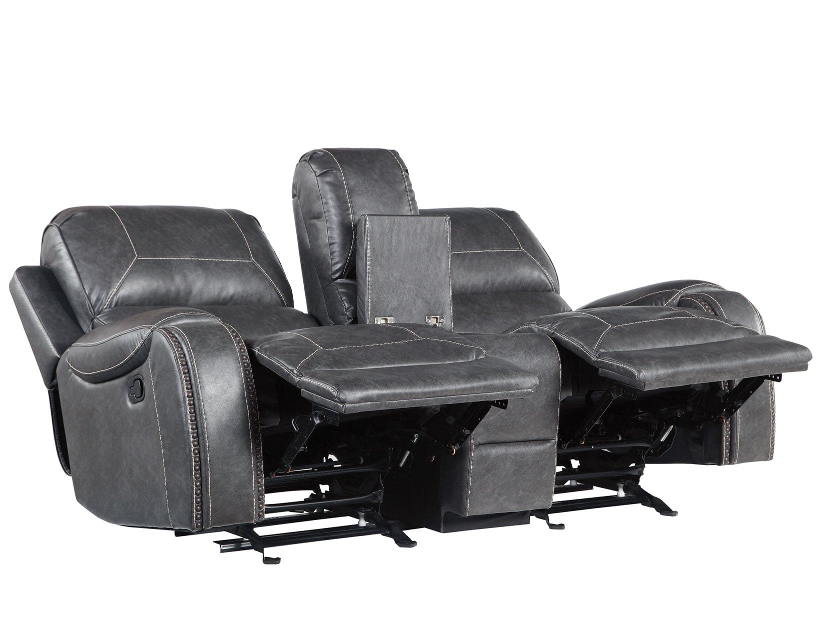 Superior comfort and style are the hallmarks of this motion set. Featuring a leather-like cover with baseball stitching, this ensemble comes with a Sofa with a drop-down console & USB charging station; a Loveseat with dual rocker/recliner ends; and a rocker/recliner Chair with 360-degree swivel. Pewter nailhead trim and padded arms complete this ultimate motion package.