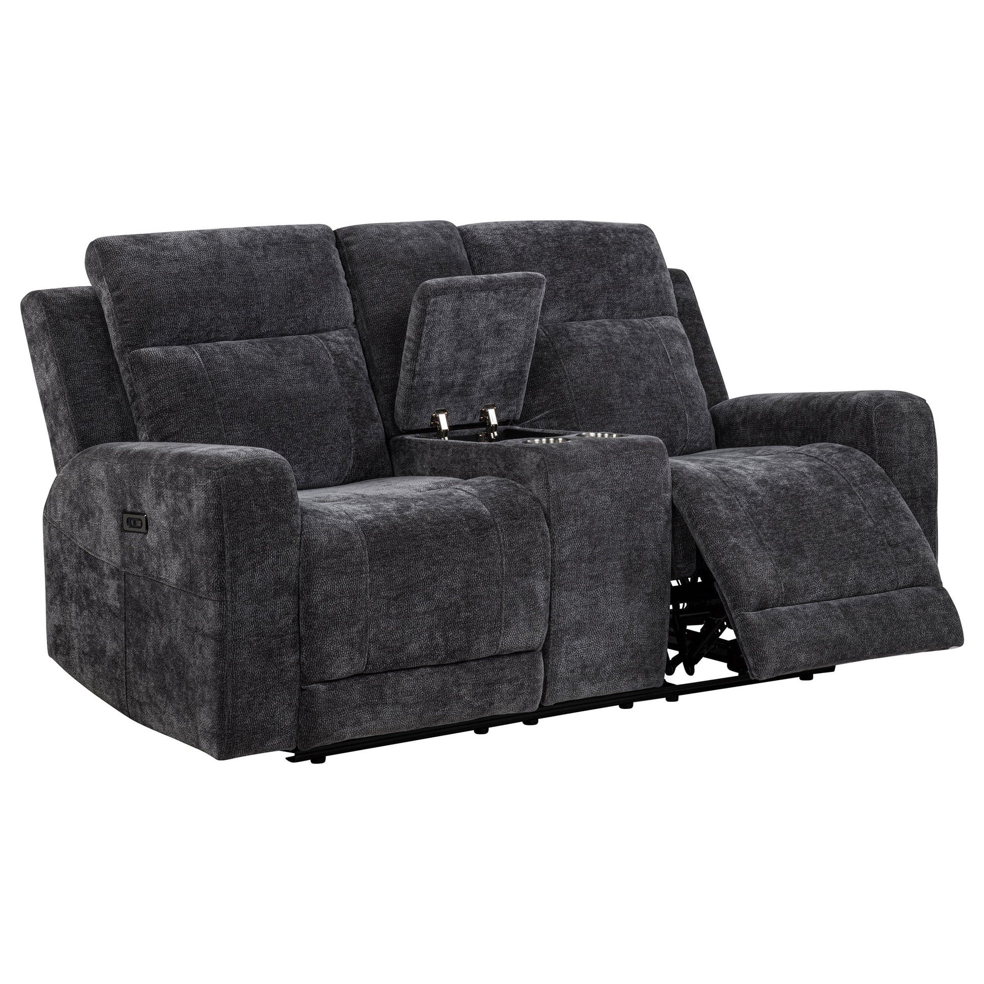 Unwind in perfect sync with this chenille power reclining loveseat, crafted for shared comfort and convenience. Dual recliners offer smooth, quiet motion at your touch, while a center console adds thoughtful storage with a lift-top compartment and two removable stainless steel cup holders. Wrapped in soft, textured chenille and reinforced with a durable metal frame, this piece blends everyday luxury with functional ease.