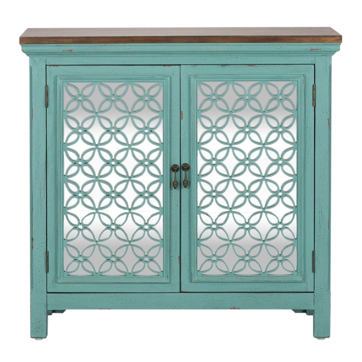 Transform your home with the Kensington 38" accent cabinet. Crafted of Eucalyptus solids and Ash veneers in a wire brushed Turquoise finish and Spice wood tone top. Features two mirrored doors with decorative floral pattern overlays, block feet and one concealed fixed shelf behind doors. A unique piece that will work with any décor from traditional to contemporary.