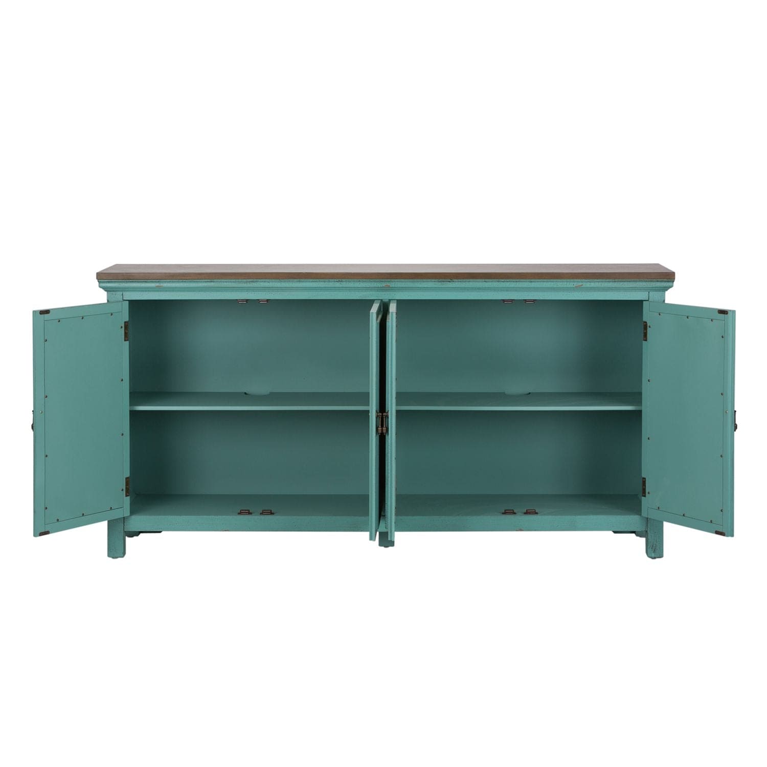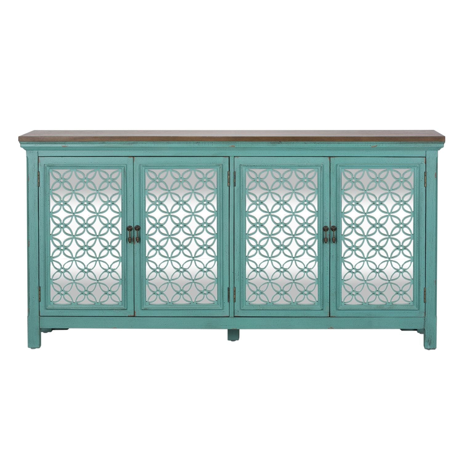 Transform your home with the Kensington 72" accent cabinet. Crafted of Eucalyptus solids and Ash veneers in a wire brushed Turquoise finish and Spice wood tone top. Features four mirrored doors with decorative floral pattern overlays, block feet and one concealed fixed shelf behind doors. A unique piece that will work with any décor from traditional to contemporary.