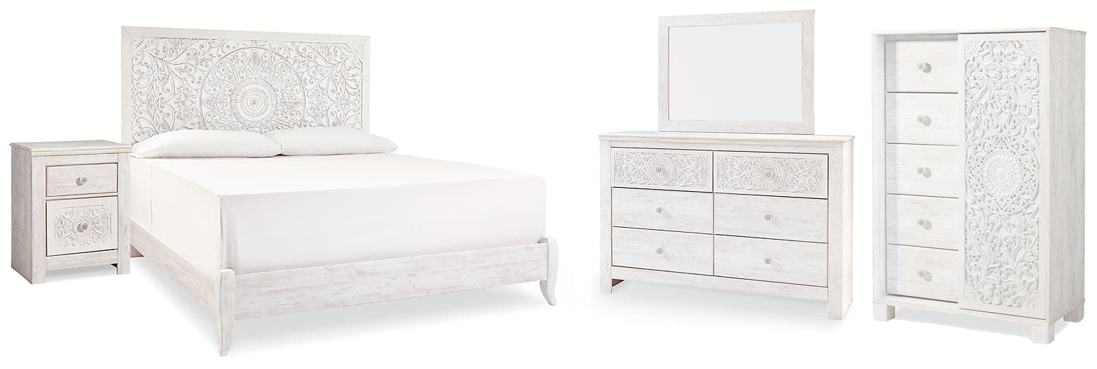 Paxberry King Panel Bed with Mirrored Dresser, Chest and Nightstand