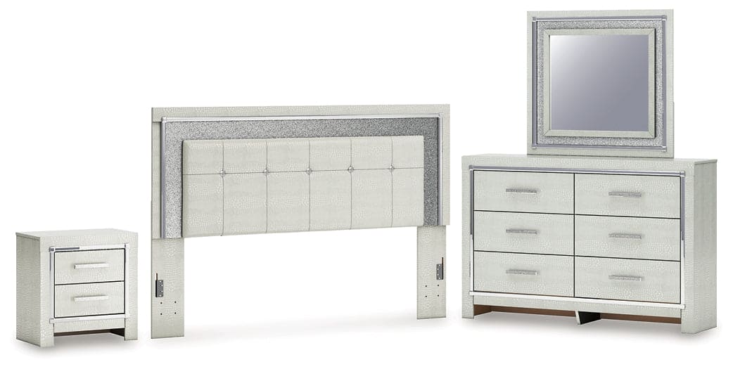 Zyniden King Upholstered Panel Headboard with Mirrored Dresser and Nightstand