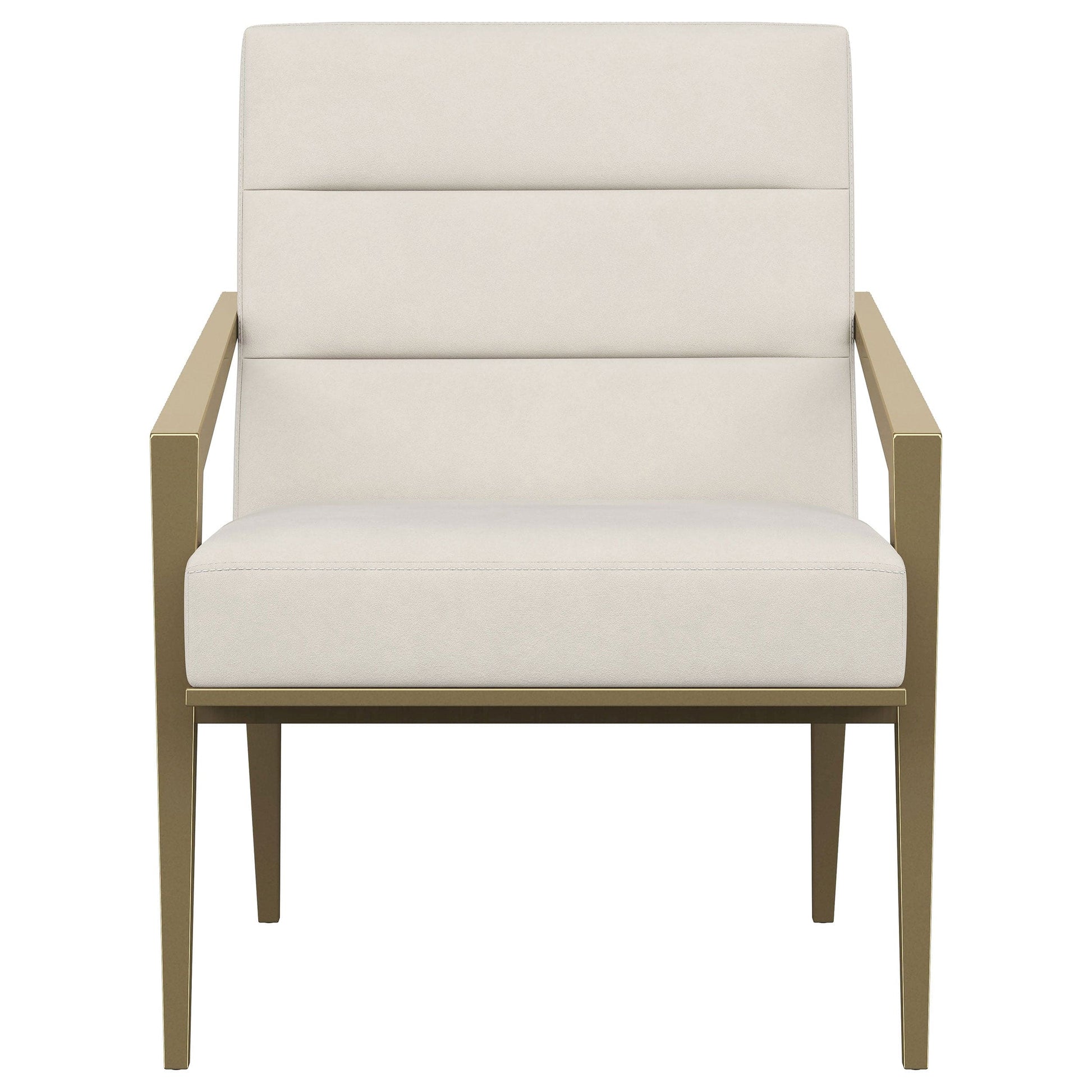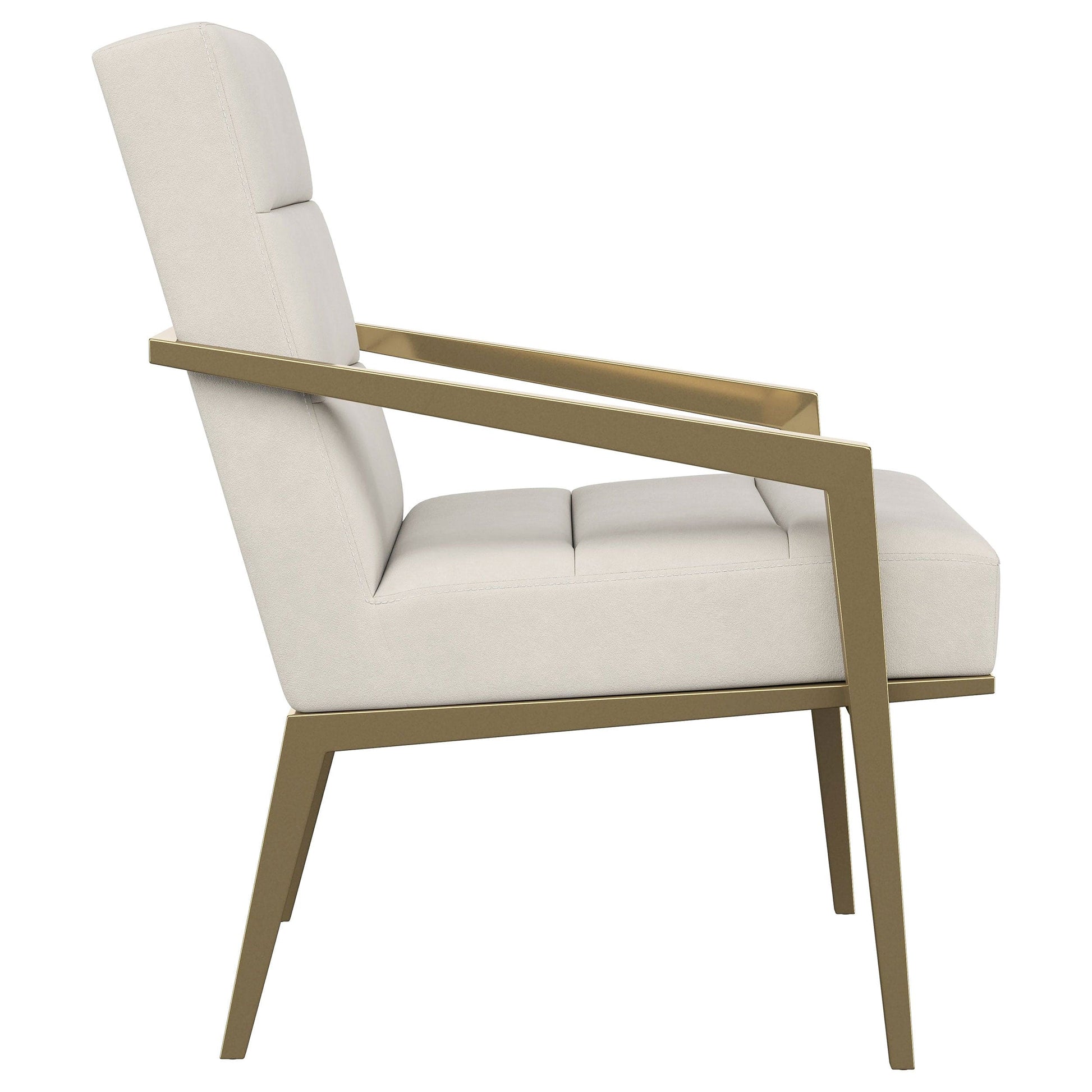 Restrained, modern style meets elegant artistry in a striking contemporary armchair. Designed to stand out, it boasts an upholstered seat and back with a metal frame and arms. The streamlined look receives a gleaming gold finish, adding sophistication anywhere from a sophisticated living room to a refined reception area in a professional space. Sloping, tapered arms define its silhouette, creating an accent chair that's sure to stand out. Channel tufting accents foam cushions, creating a sense of depth and dimension you'll appreciate in any setting.