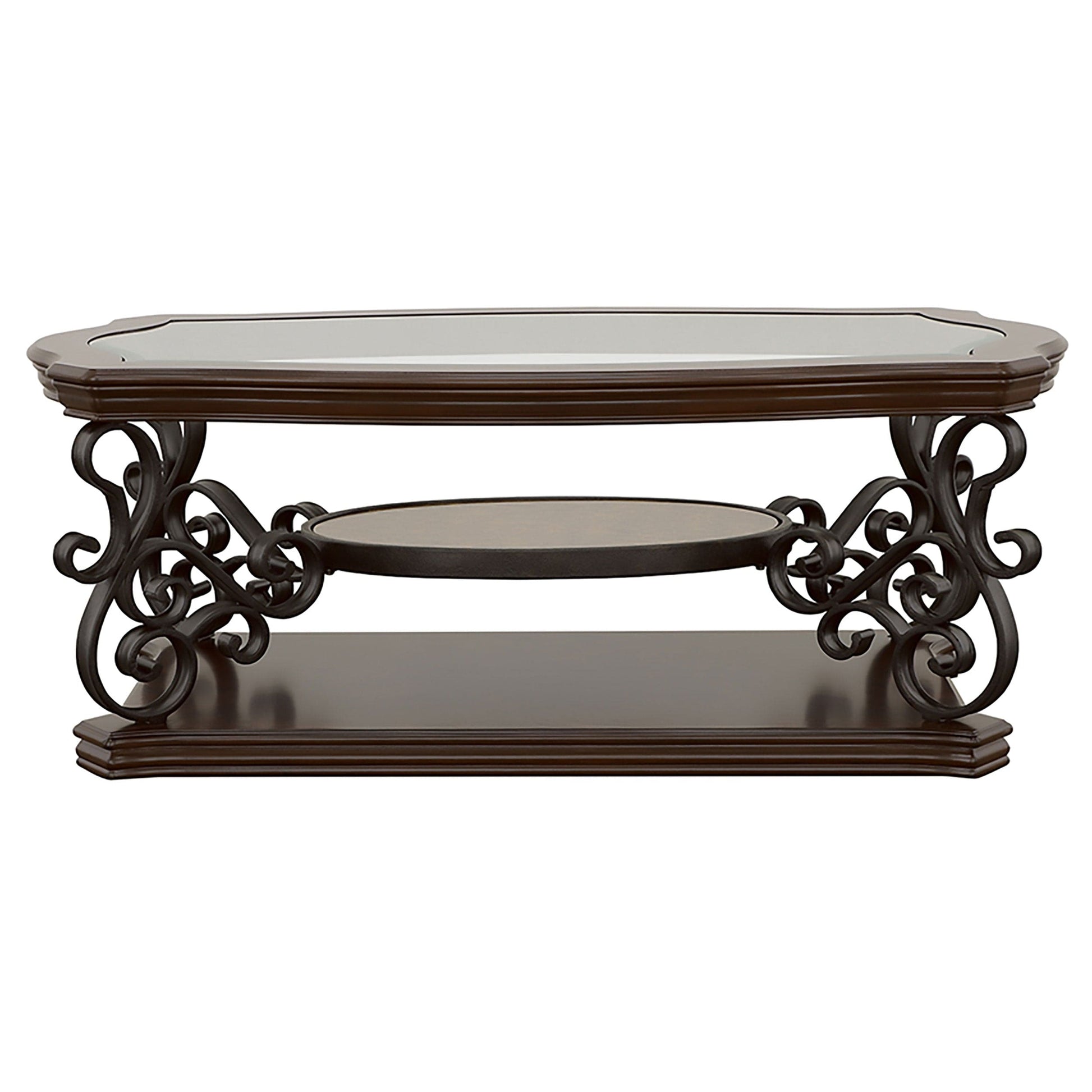This elegant coffee table blends timeless design with practical functionality. The clear tempered glass top offers durability and a polished look, while the dark bronze powder-coated metal legs add a refined touch. A dark merlot wood finish highlights the engineered wood and cherry veneer construction. The middle shelf features a glossy wooden surface, offering additional display or storage space. Intricate scrollwork detailing enhances the classic appeal, making it a perfect centerpiece for any living room.