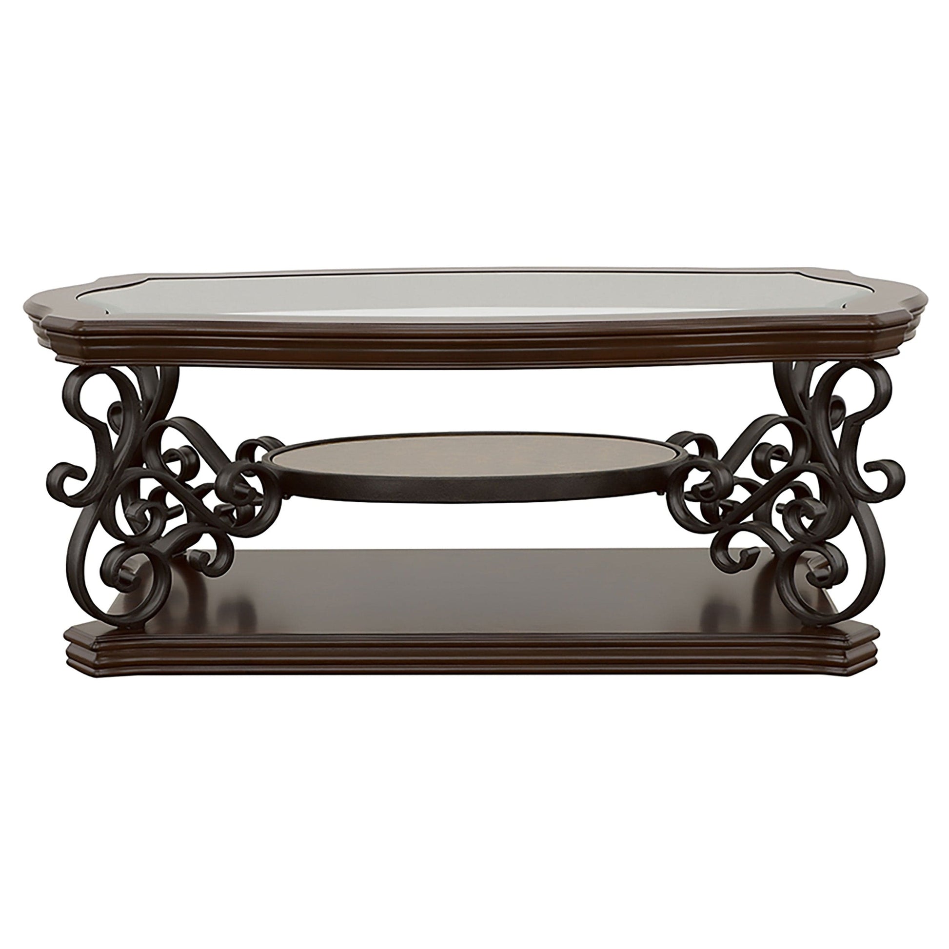 This sophisticated coffee table set combines timeless elegance with functional design. Each piece features a clear tempered glass top for durability and a polished look, supported by ornate scrollwork on dark bronze powder-coated metal legs. The dark merlot wood finish enhances the engineered wood and cherry veneer construction, while the middle shelves provide additional storage with their polished wooden surfaces. Perfect for elevating any living room with coordinated and classic appeal.