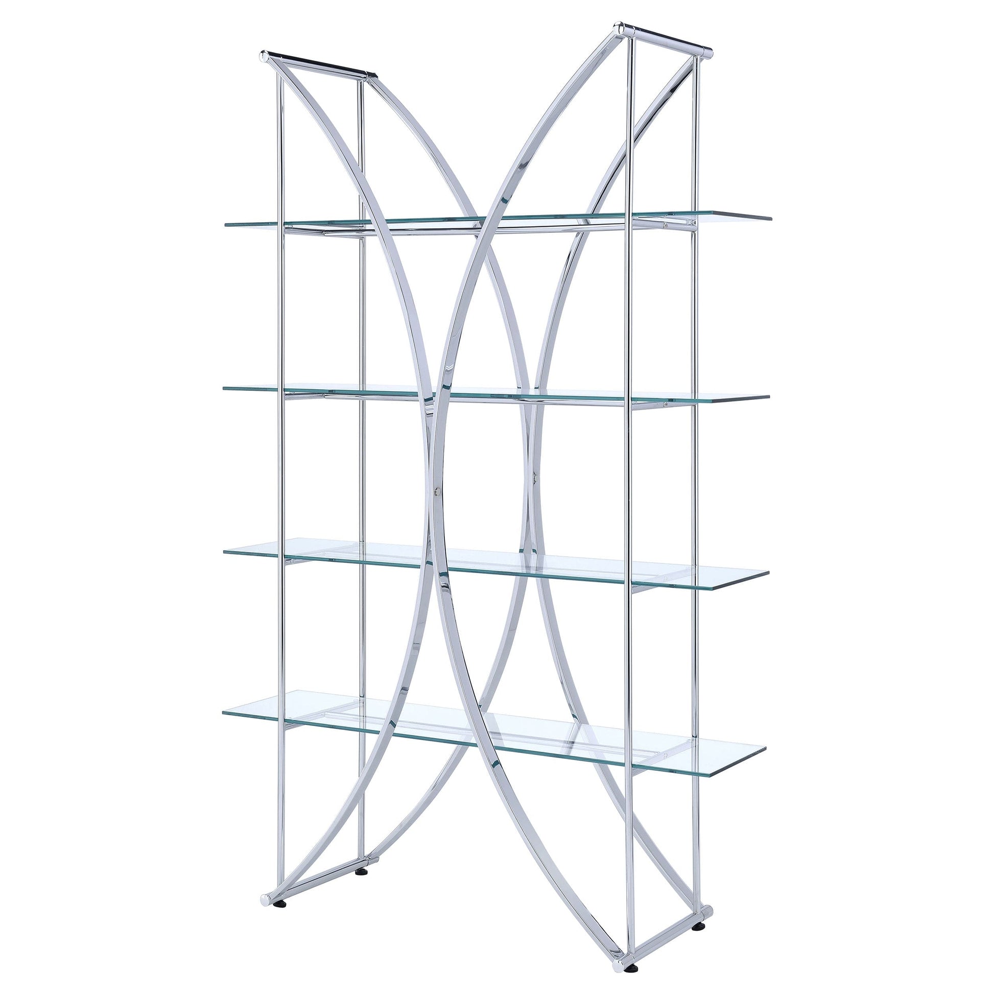 The ultimate in contemporary design rests in this eye-catching bookcase. Modern architecture meets art in a compelling silhouette blending arc-shaped and linear steel frames with clear tempered glass shelves. Four tiers offer ample space for displaying books, decor, and potted greenery. A fresh chrome finish adds luster to a tastefully designed contemporary space. Energize a modern room with a subtle yet tasteful bookcase.