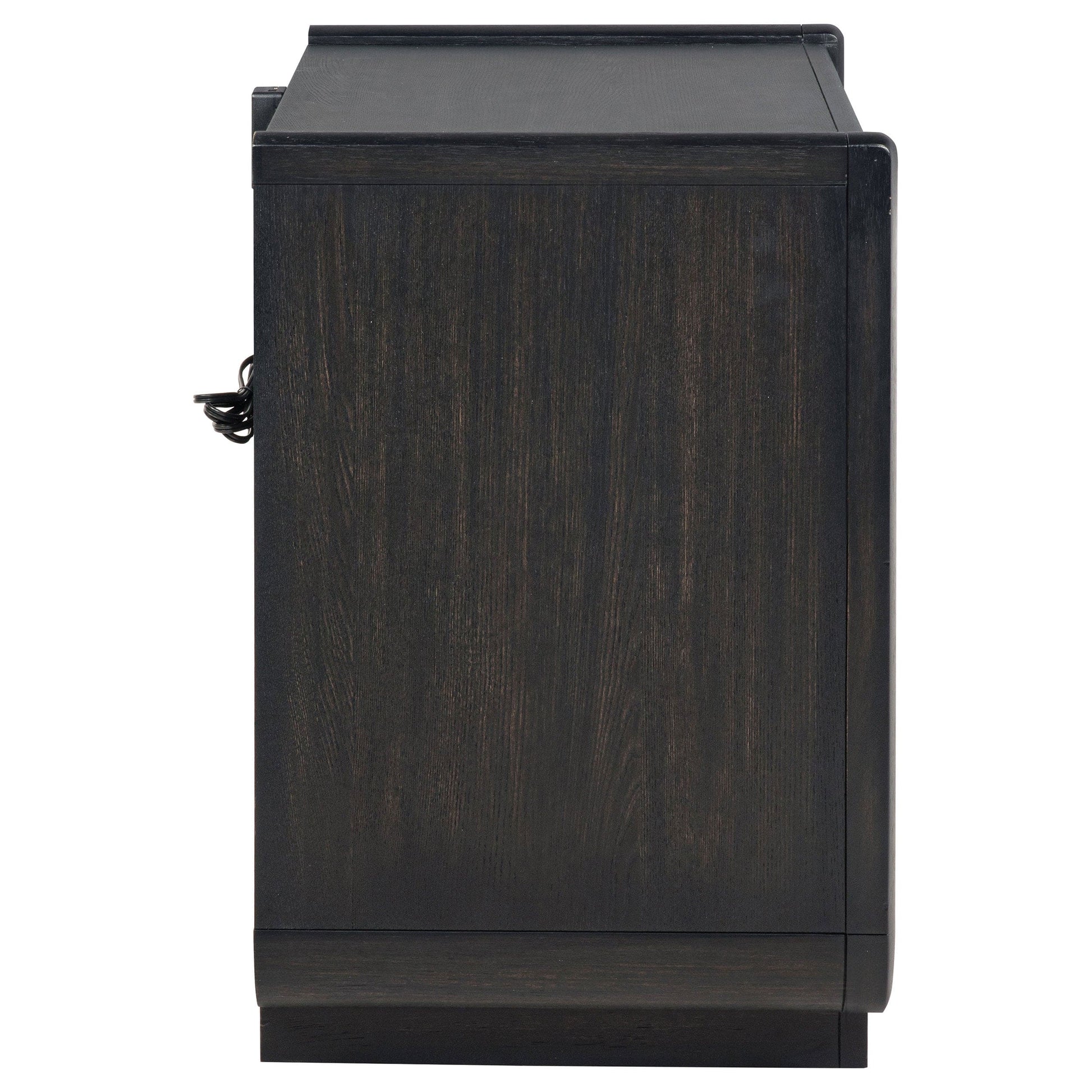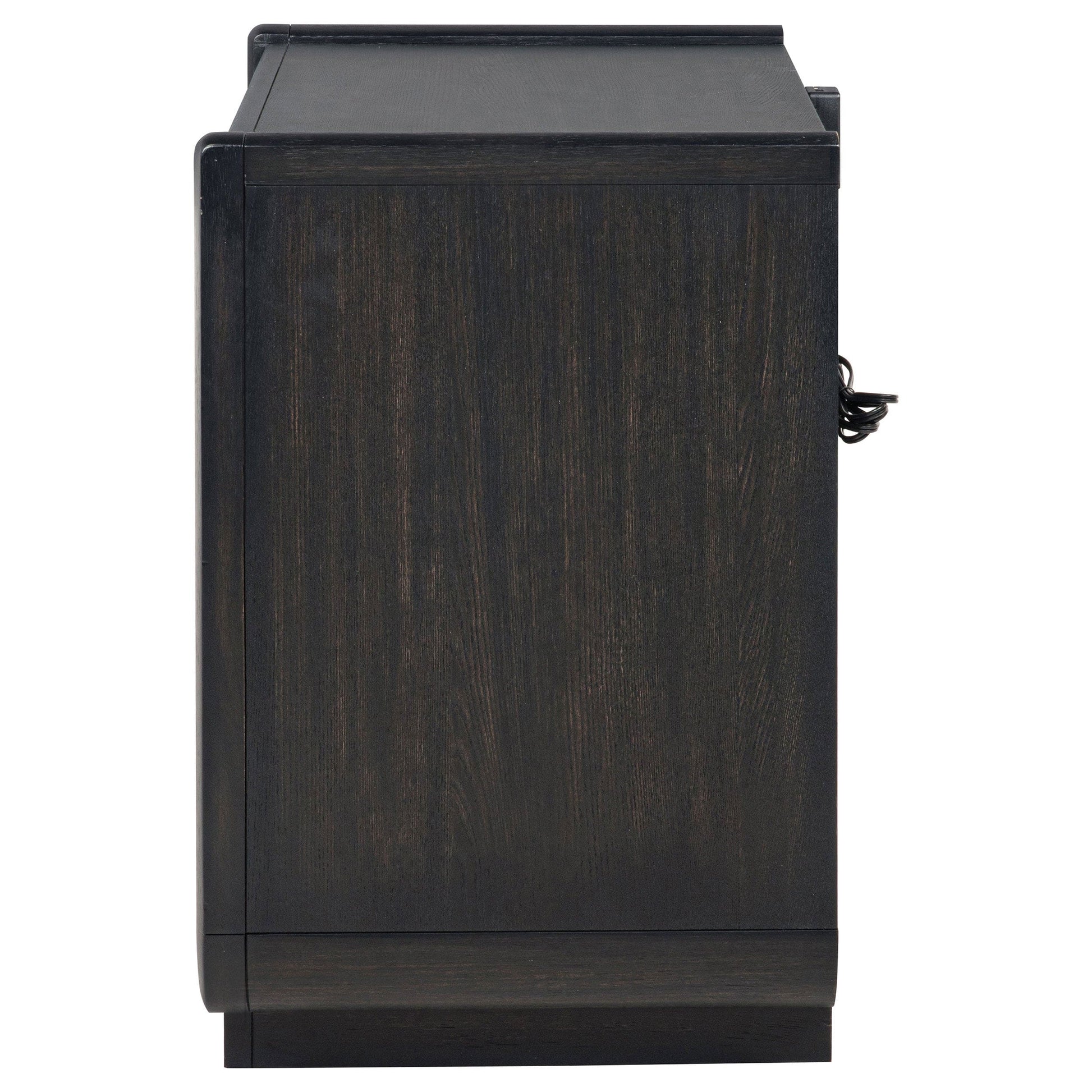 Dark elegance and quiet innovation come together in this two-drawer nightstand, where softened curves and a burnished black finish evoke serene sophistication. A warm LED-lit shelf casts a golden glow beneath the top drawer, creating ambiance for evening hours. Dual USB ports keep modern essentials close, while a black felt-lined drawer cradles delicate keepsakes. Built with soft-closing glides, English dovetail joinery, and a dust panel, this piece blends function with intimate beauty.