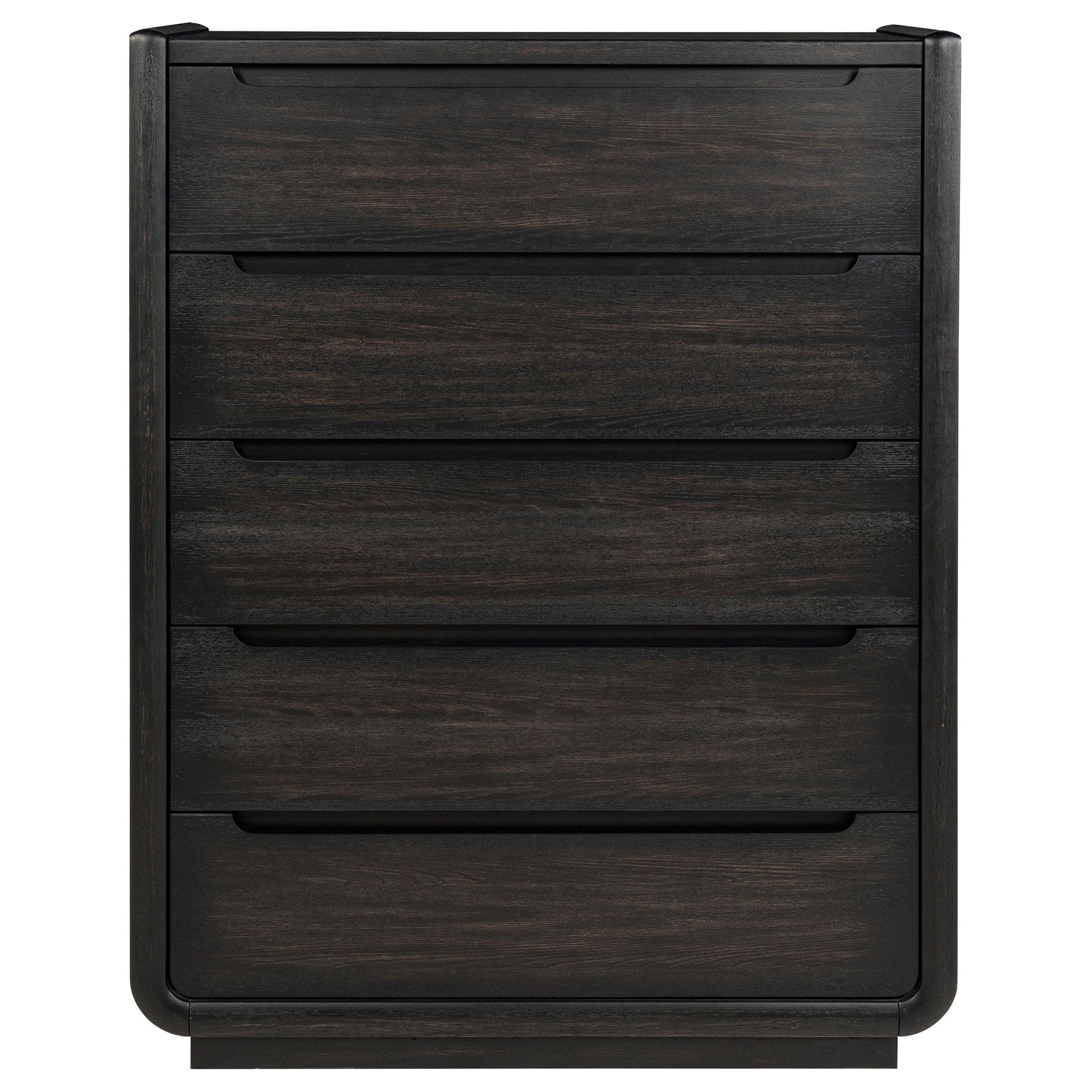 Balance and beauty meet in this five-drawer chest, where softened curves and a deep burnished black finish bring quiet depth to the room. Recessed pulls and rounded corners echo a modern sensibility, while black felt-lined top drawers protect what matters most. Designed with English dovetail joinery, soft-closing glides, and a fully enclosed dust panel, this tall silhouette blends sculptural refinement with everyday function.