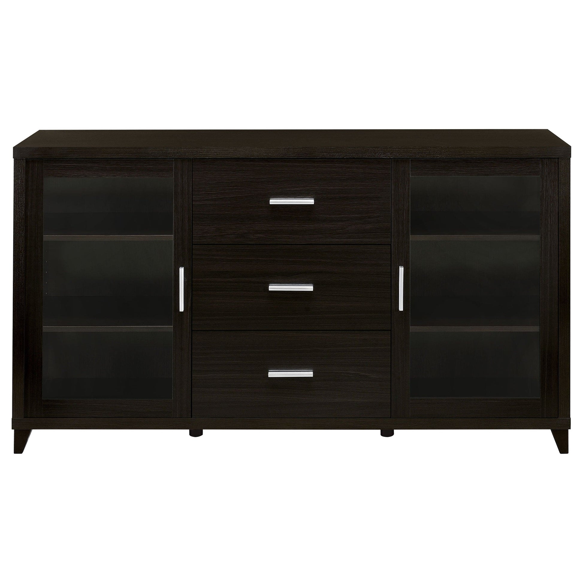 Elevate your living room with this four-piece entertainment center, finished in rich cappuccino for a sleek contemporary look. The 60-inch TV console accommodates televisions up to 60 inches and includes two framed clear tempered glass doors, adjustable shelving, and three drawers for organized storage. Flanking media towers provide additional open shelving for books and decor, along with two drawers each for concealed items. A connecting bridge tops the unit, featuring two enclosed compartments to complete the design. Brushed silver hardware and tapered legs add refined finishing touches.