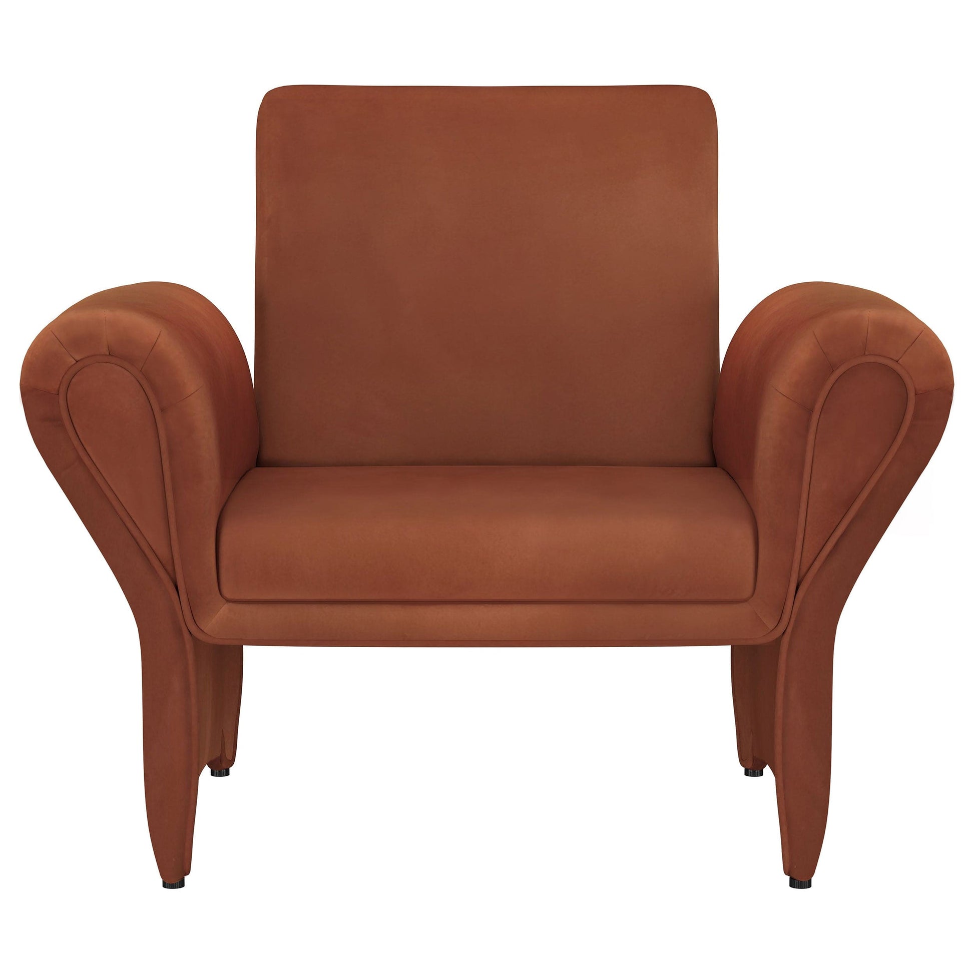 Play with color when you choose the bold hues of a modern accent armchair. In deep rust, it boasts velvety soft upholstery and a sculptural silhouette that blends timeless design elements to create a look that's new and fresh. A pair of rolled arms are delicately flared to create a teardrop effect. This detail highlights the slim nature of its panel legs, offering light, airy character to a robust seat and slender back. Choose the perfect placement for an armchair designed to stand out.