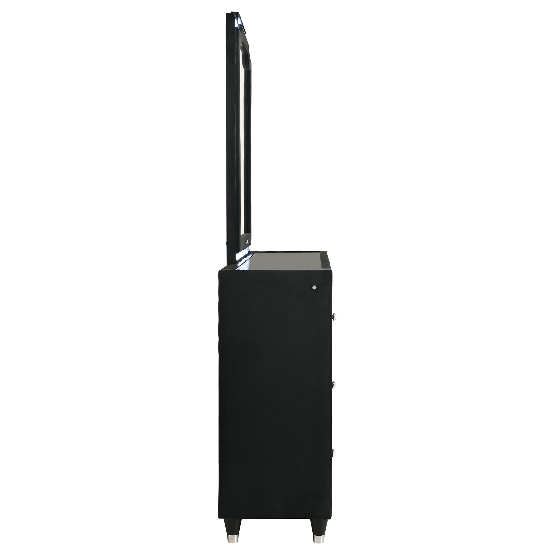 This dresser and mirror set blends soft velvet textures with luminous design for a refined bedroom statement. Fully wrapped in a black velvet, the eight-drawer dresser features a clear tempered glass top, LED trim, crystal knobs, and reflective acrylic touches. Above, the tri-panel mirror offers LED lighting and velvet framing. With felt-lined drawers, dovetail joints, and solid rubberwood legs, this set balances elegance with enduring practicality.