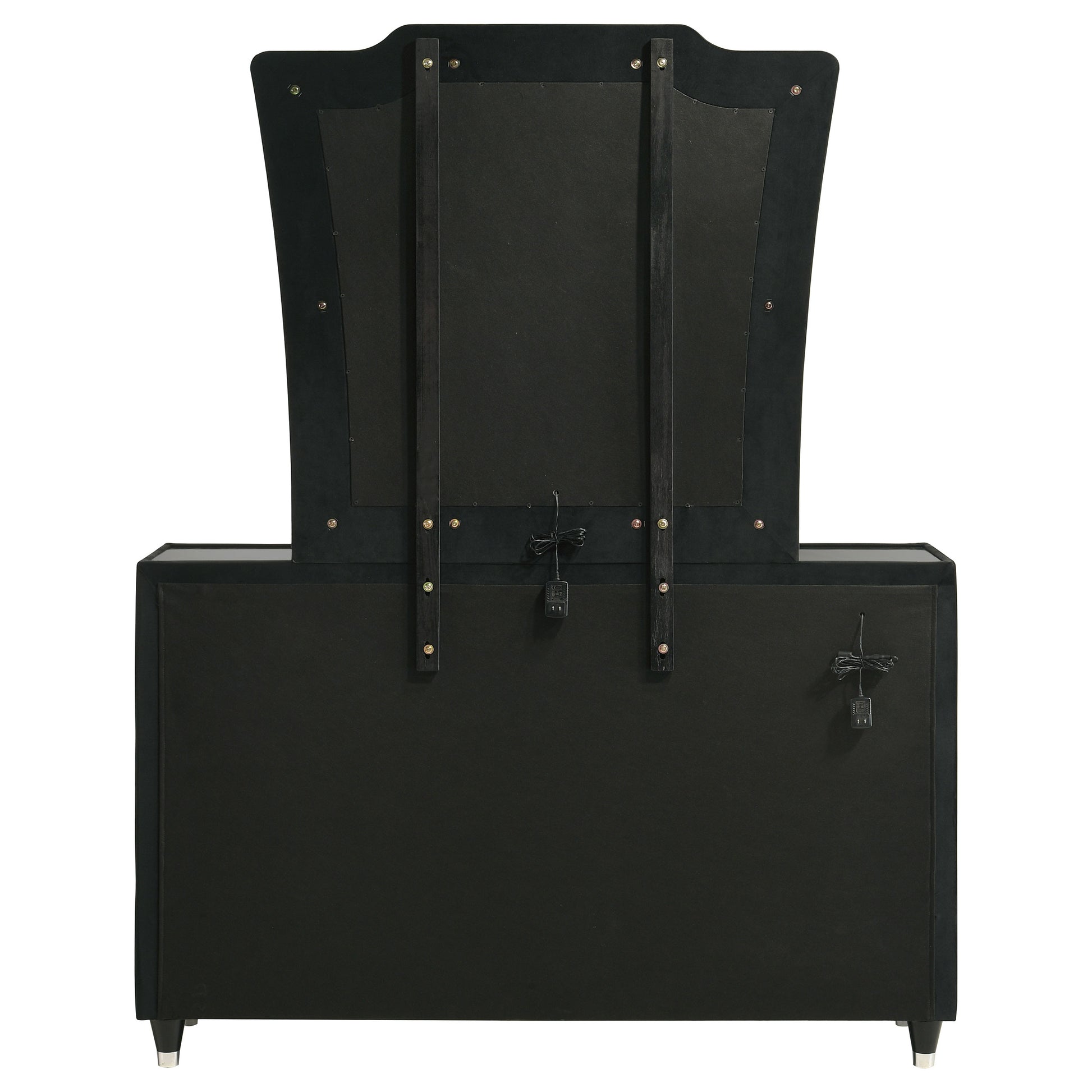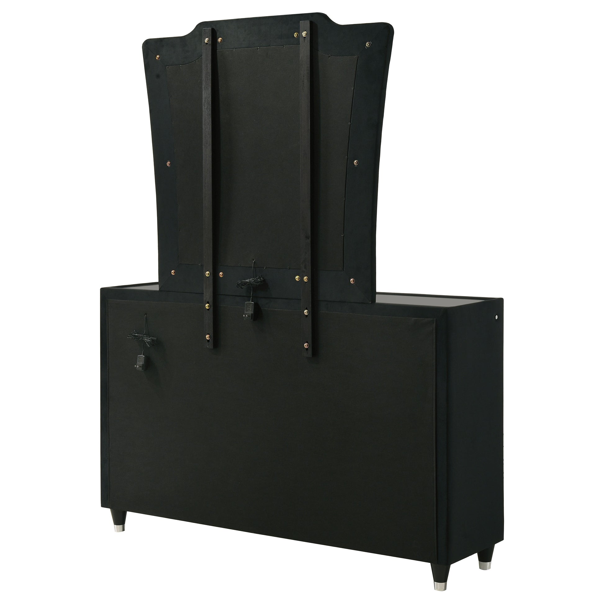 • Dresser and mirror set with LED-lit case frame and velvet wrap in a black