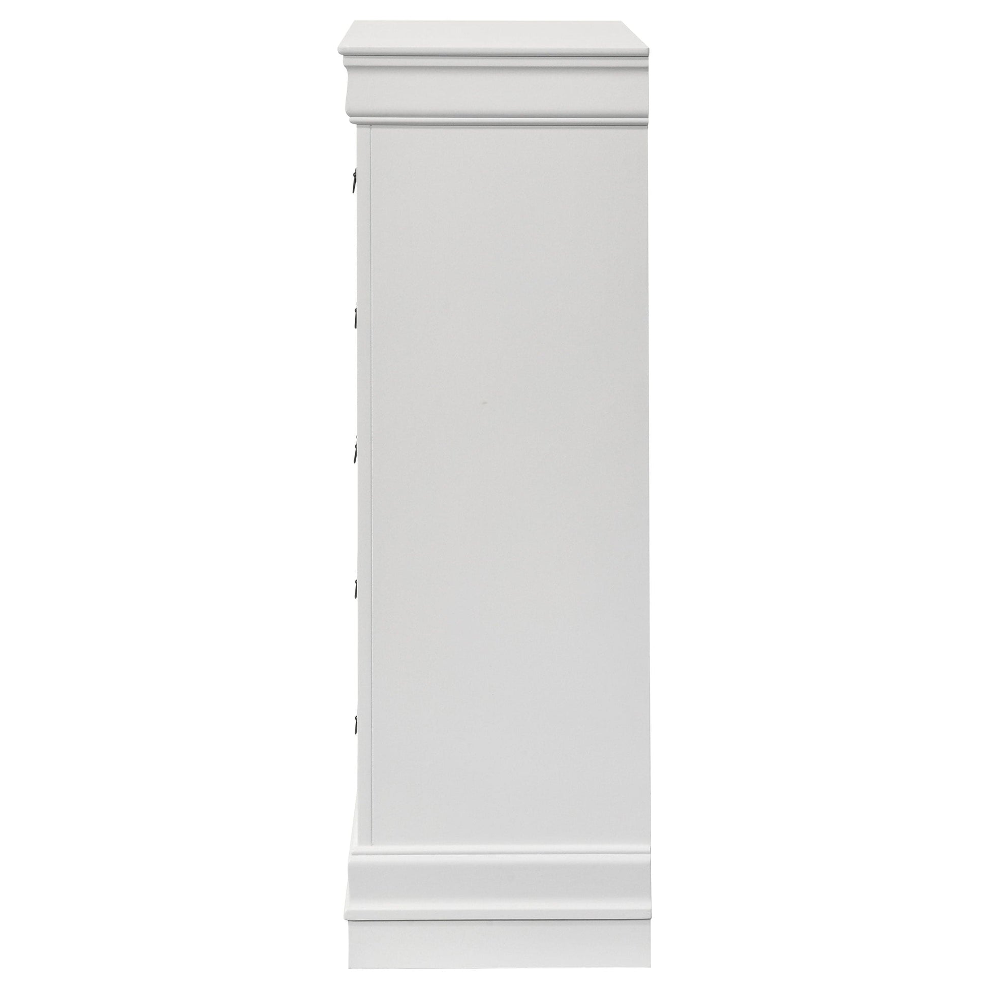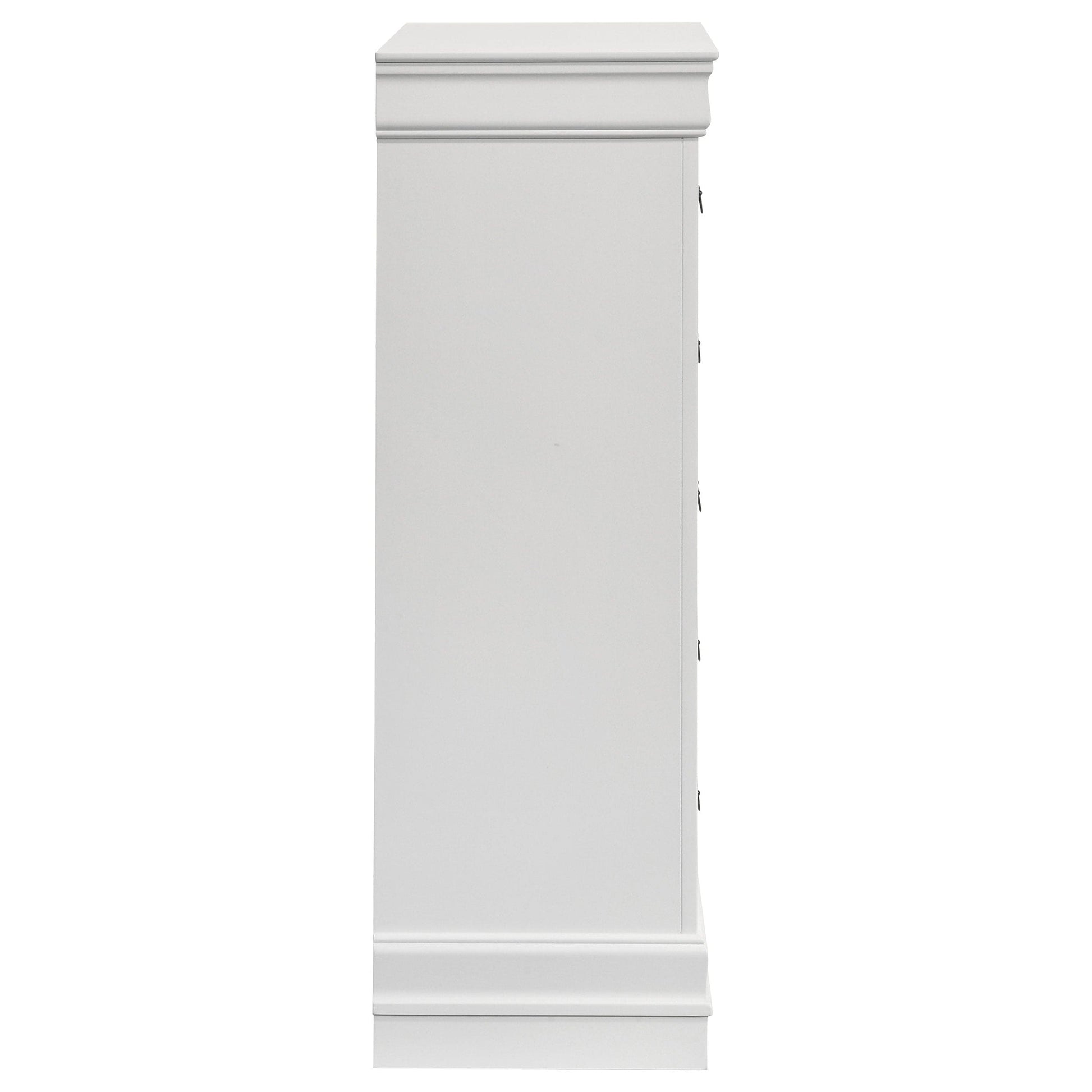 Complete your stylish bedroom with the ample storage provided by this transitional five-drawer chest. It's cool white finish blends in a variety of bedroom spaces, creating a fresh, approachable look. Each drawer features a hanging pull in a dark finish, creating a touch of character and contrast. Molded trim and bracket feet complete the look with a hint of movement. Use the top for a valet or jewelry box or choose decor that adds a personal touch.