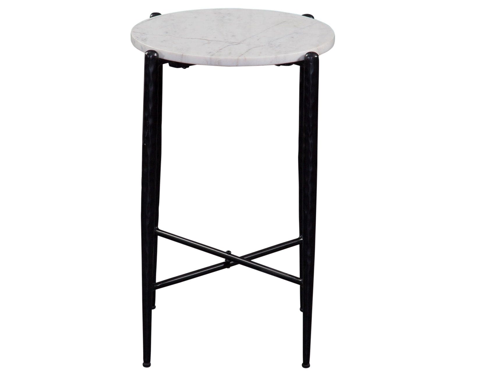 The Loxie Solid Marble Top 16″ Round End Table combines delicate elegance with surprising strength An able companion to a favorite chair, this compact table features a flowing round shape with a solid white marble top nestled in a beautifully tapered, powder-coated iron base. With its refined design and sturdy construction, the Loxie table is a versatile piece that brings timeless elegance to any room.