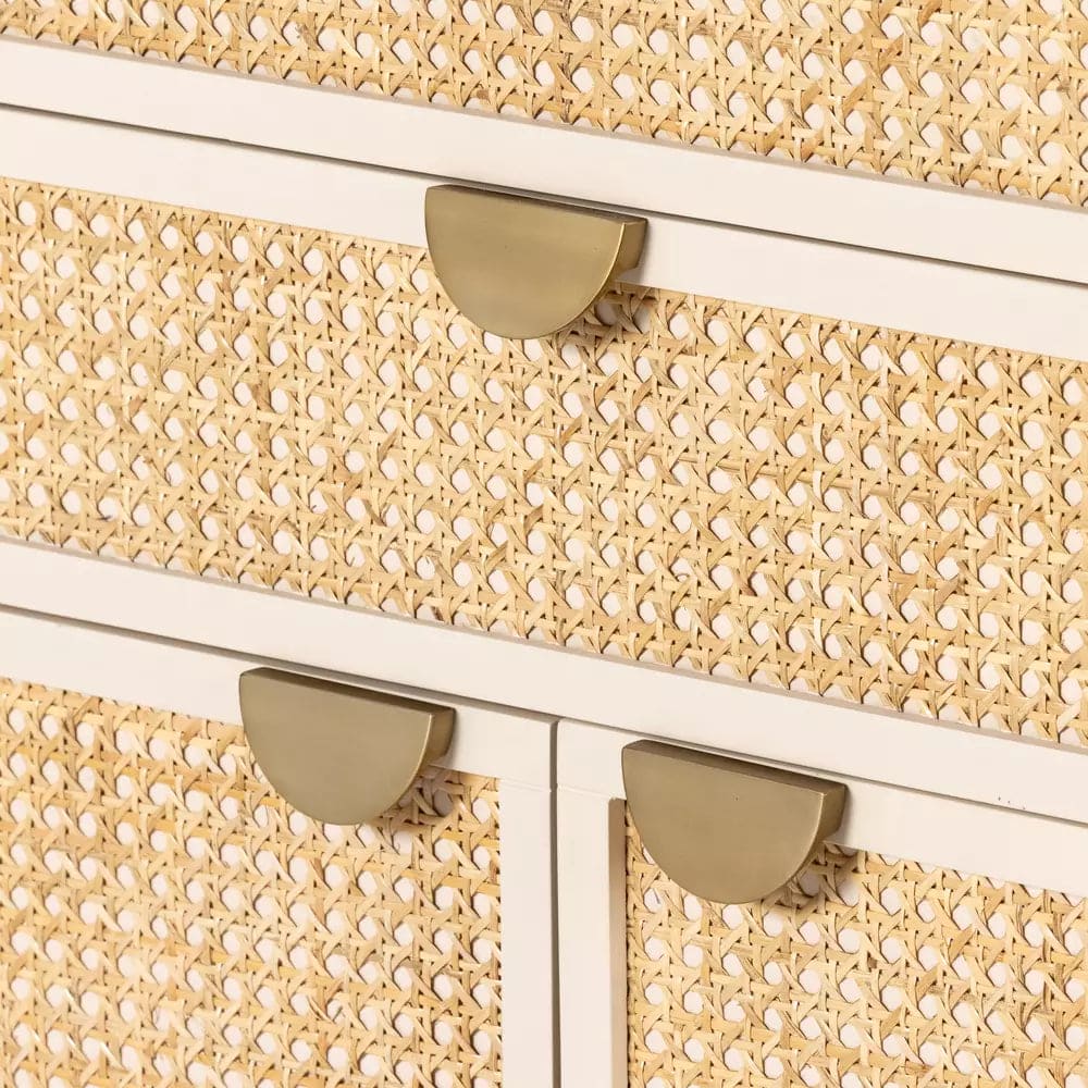 Bring a light look to bedroom styling. A tall, lacquered dresser features woven cane panels and half-moon hardware finished in an aged brass. Four drawers plus cabinetry with interior shelving for generous storage space.