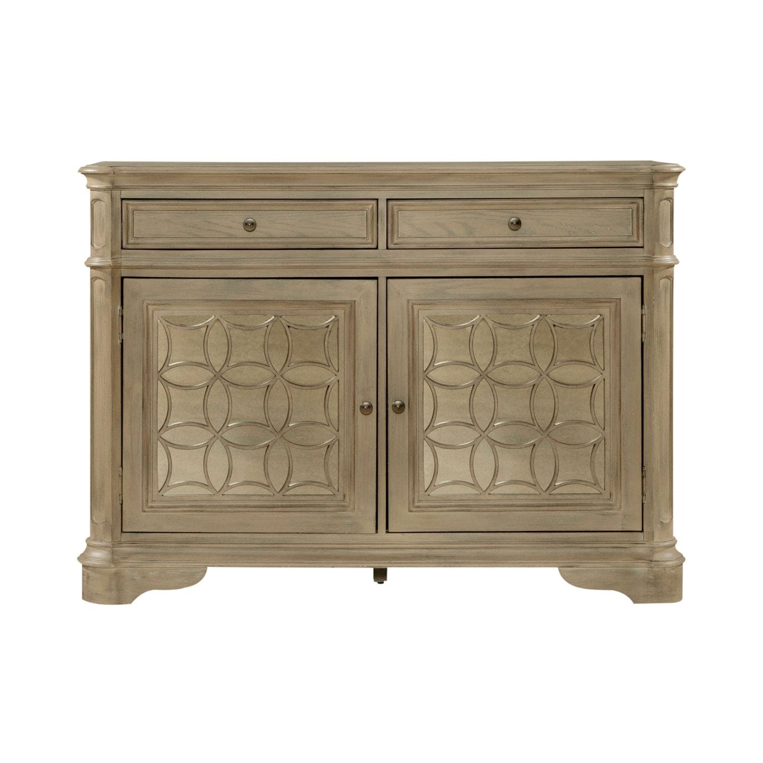 Make entertaining easy and stylish with the Magnolia Manor II buffet. Crafted with excellence using Poplar solids and Split Heart White Oak veneers, this piece features a Weathered Bisque finish. Two fully stained full extension drawers with felt lining create storage galore when combined with the two antique mirrored doors with one adjustable shelf behind each door. The mirrored doors feature a decorative grid overlay for added design appeal. The doors offer design flexibility with the option to switch the mirror for an included wood panel. Canted corners blend with the rounded pilasters that flow to shaped bracket feet. European influences in the Magnolia Manor II buffet makes for a truly unique style for any living space.