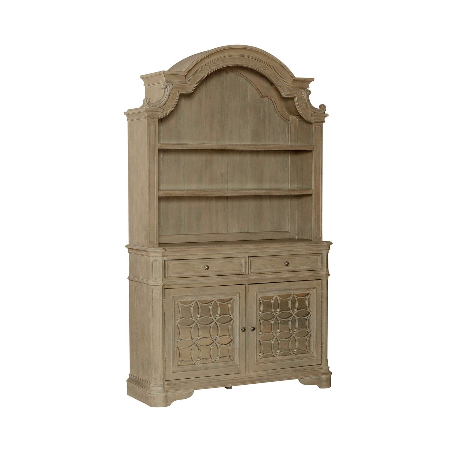 Make entertaining easy and stylish with the Magnolia Manor II hutch and buffet. Crafted with excellence using Poplar solids and Split Heart White Oak veneers, this set features a Weathered Bisque finish. The hutch offers a softly arched shape with dog bone accents and bead molding. Use the touch LED lighting to illuminate your display on the two wood framed adjustable glass shelves against a planked back panel. Place the hutch on top of the buffet, which features two full extension felt lined drawers and two wood framed doors with antique mirrors and a decorative grid onlays. This piece offers design versatility, with two included wood panels that can be swapped out with the antique mirrors for a different style. There is one adjustable shelf behind each door. Canted corners and rounded pilasters flow to shaped bracket feet. European influences in the Magnolia Manor II hutch and buffet makes for a truly unique style for any living space.