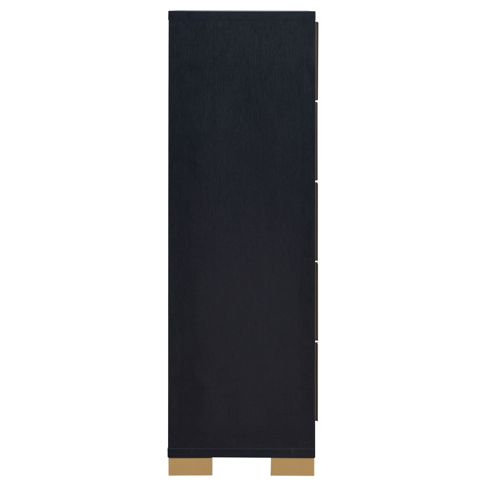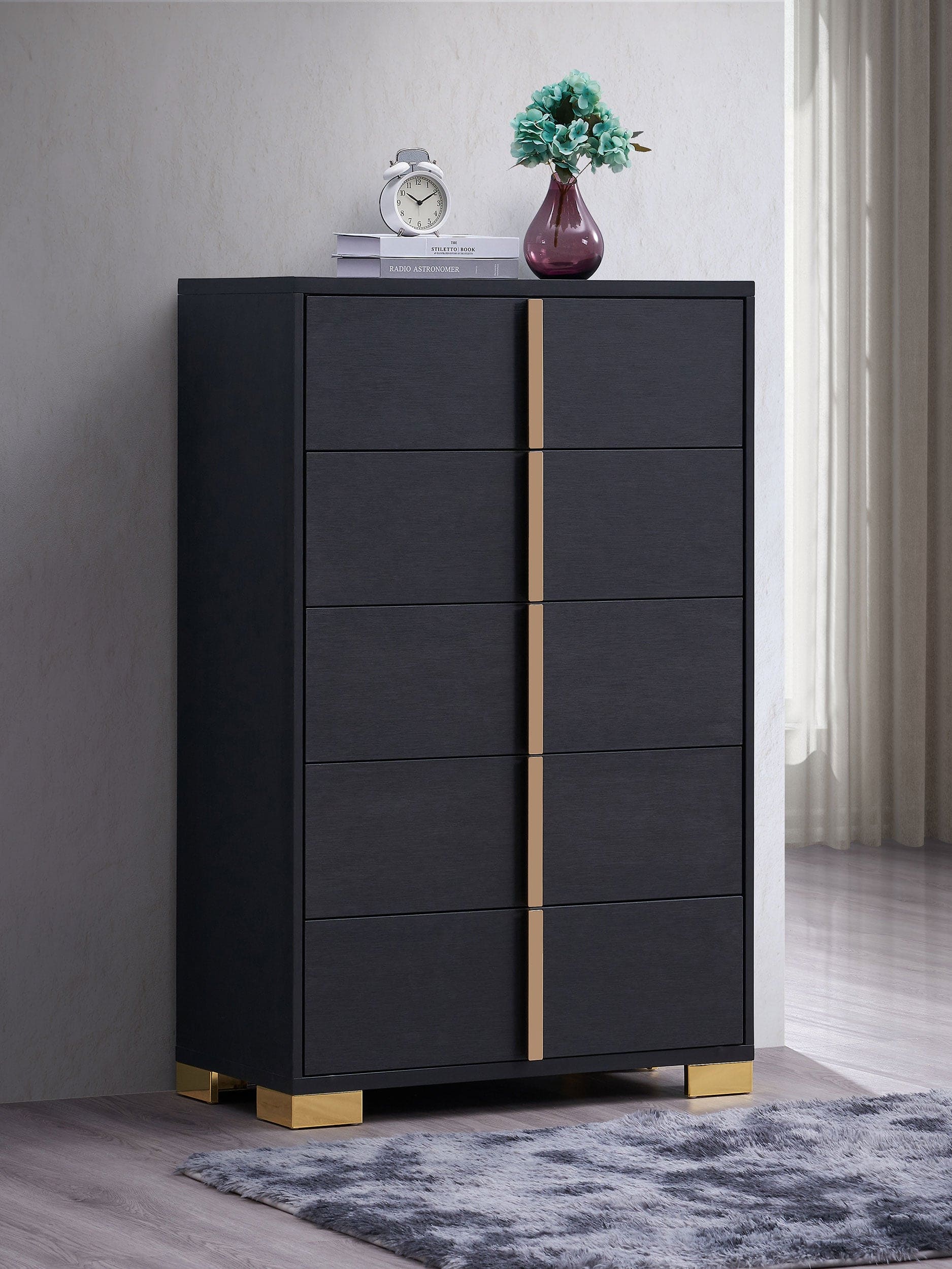 Minimalism never looked so elegant as it does in this elegant five-drawer chest, an excellent option for your updated bedroom ensemble. Modern design details produce a chic vertical chest with an Art Deco vibe and tons of storage space. Made of wood products, this five-drawer chest features a versatile finish with accenting from gold finish metal, placed carefully to emphasize a geometric linear effect. Store incidentals and accessories in drawers operating smoothly on center metal glides. English dovetail drawer construction embellishes this chest’s quality, as vertical gold metal drawer hardware offers a unique impact.
