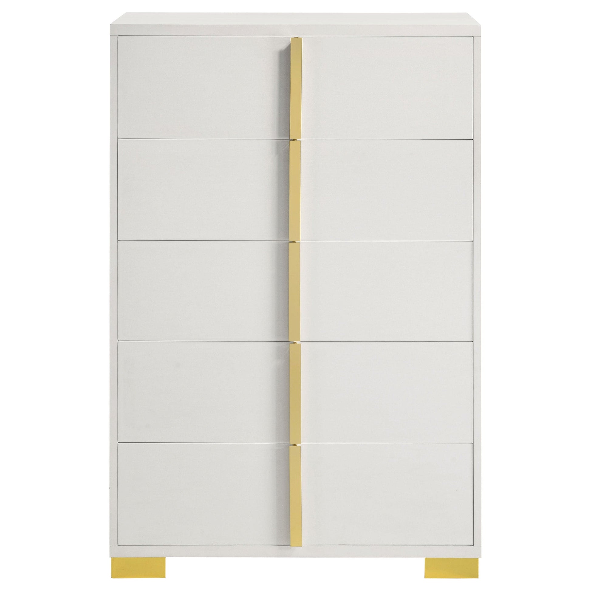 Minimalism never looked so elegant as it does in this elegant five-drawer chest, an excellent option for your updated bedroom ensemble. Modern design details produce a chic vertical chest with an Art Deco vibe and tons of storage space. Made of wood products, this five-drawer chest features a versatile finish with accenting from gold finish metal, placed carefully to emphasize a geometric linear effect. Store incidentals and accessories in drawers operating smoothly on center metal glides. English dovetail drawer construction embellishes this chest’s quality, as vertical gold metal drawer hardware offers a unique impact.