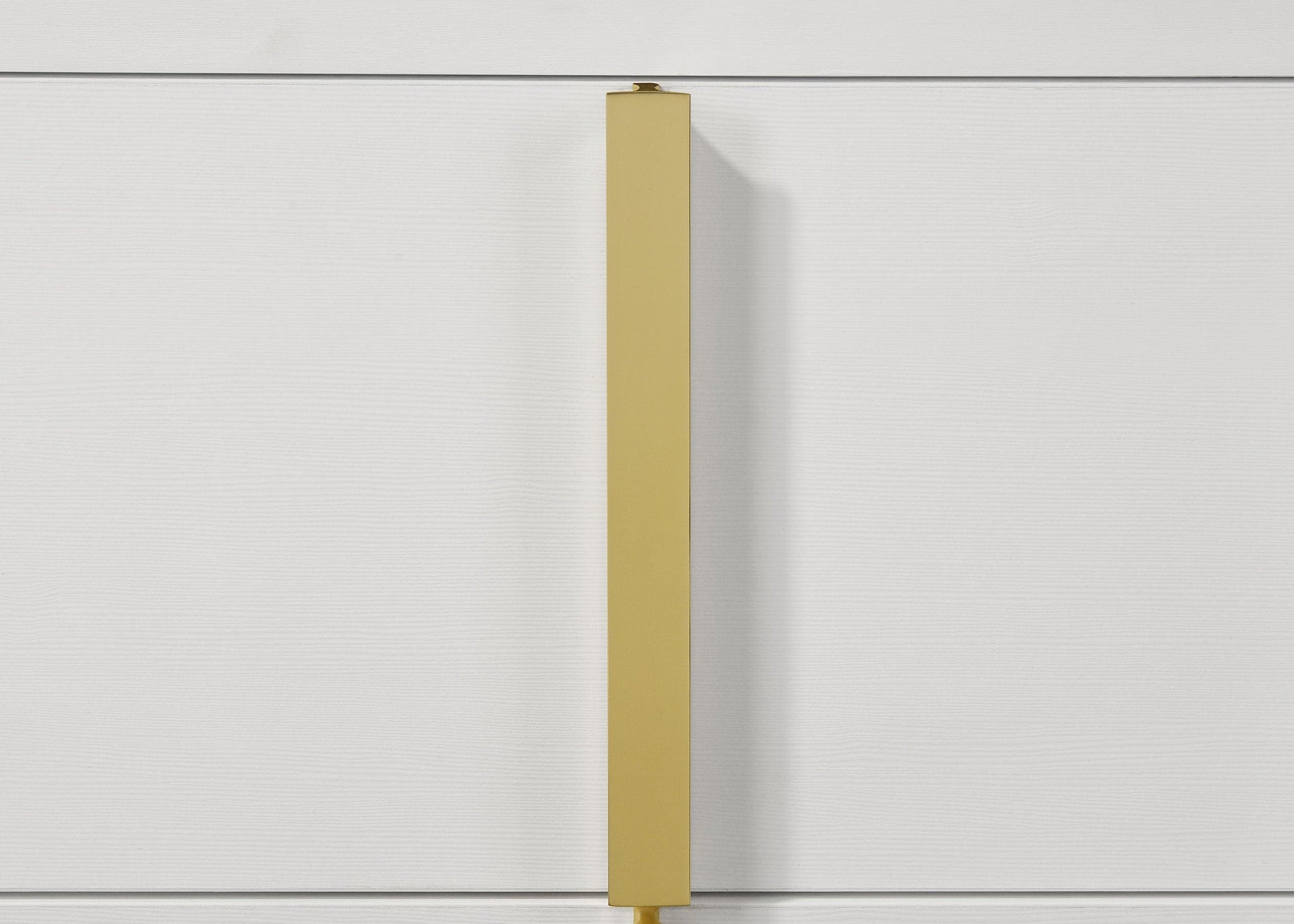 Soak up the sleek and simple yet compelling look of a six-drawer dresser with a dramatic aesthetic that changes the tone of your contemporary bedroom. Modern design details produce a chic vertical dresser with an Art Deco vibe and tons of storage space. Made of wood products, this six-drawer dresser features a versatile finish with glam accenting from gold finish metal, placed carefully to emphasize a geometric linear effect. Store incidentals and accessories in drawers operating smoothly on center metal glides. English dovetail drawer construction embellishes this dresser’s quality, as vertical gold metal drawer hardware offers a unique impact.