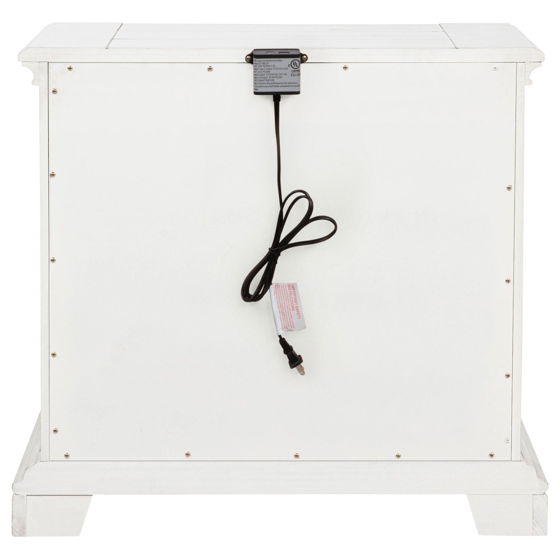 Charming and functional, this two-drawer nightstand blends classic design with thoughtful details. A vintage white finish softens the ornate carvings and sculpted base, while antique bronze handles bring graceful contrast. Dual USB ports are hidden at the back for modern convenience, while felt-lined drawers offer protected storage. Built from poplar and engineered wood, it balances timeless beauty with everyday function.