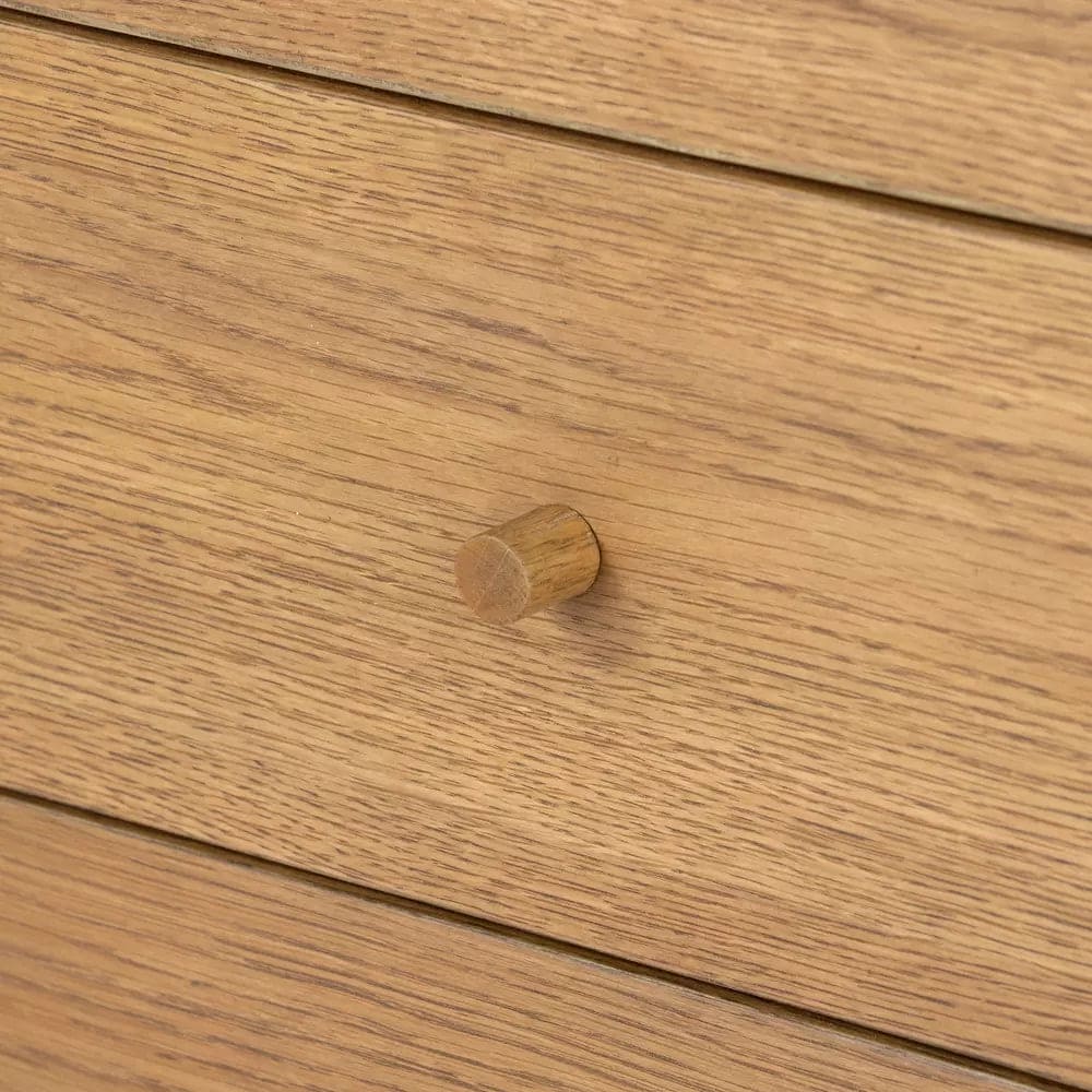 With simple shaping inspired by midcentury casing, exposed framework and a warm oak finish bring a handcrafted, minimalist look to modern bedroom styling, with five spacious drawers for ample storage.