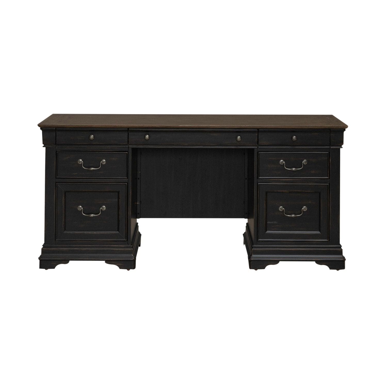 Creativity starts with the Meritage jr. executive credenza. Meticulously crafted using Poplar solids with Birch and Maple veneers, this piece features an Aged Charcoal with rub thru and Caramel finish. There are seven drawers with wood-framed fronts, each drawer is designed to provide ample storage space while exuding timeless charm. Among these, two locking file storage drawers offer added security and organization for your important documents. Also included is a flip down keyboard drawer offering a seamless solution for your typing needs while ensuring efficient wire management. The credenza is further distinguished by its heavy base molding, which not only adds structural integrity but also lends a refined finish to the piece. Completing the look are the Antique Pewter bail pull and knob hardware, providing a tasteful contrast and enhancing the overall traditional-inspired allure of the credenza. Make an impressive statement with the Meritage jr. executive credenza.