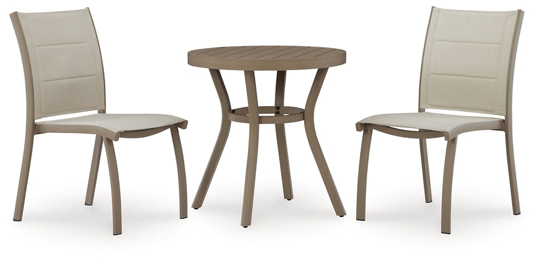 Craft a chic outdoor seating area with this table and chair set. Outfitted in contemporary neutral hues, it's an ideal spot for sipping drinks poolside or relaxing on the porch. Sturdy aluminum construction and sling seating round out the set with both durability and comfort.