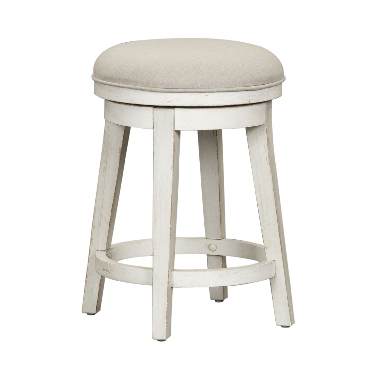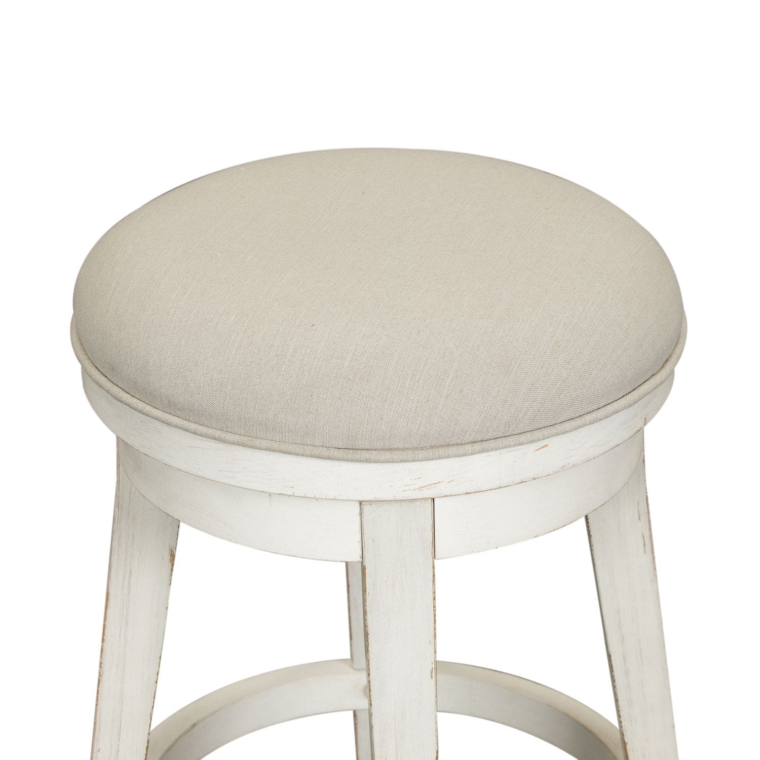 The Modern Farmhouse console stools are very versatile and can be used with our console bar, kitchen island or counter height tables. Designed to work with any décor from cottage to contemporary. Crafted of solid rubberwood legs in a flea market white finish. Features a cushioned upholstered seat with a return swivel.