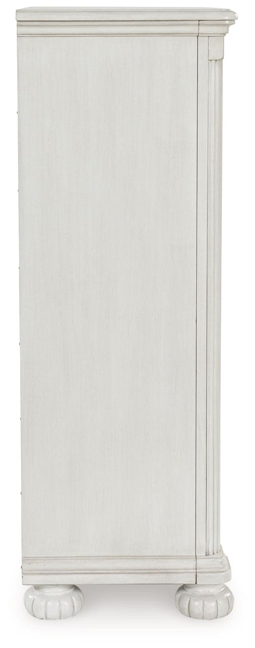 | Details | Made with hardwood solids, veneer and MDF substrate with cast resin components, Antiqued white finish, Metal pulls with polished pewter-tone finish, 5 smooth-gliding drawers with fully finished interiors, Drawers with French/English dovetail construction and heavy-duty ball-bearing side glides (top drawer felt lined), Thick decorative moulding, Reeded bun feet | |