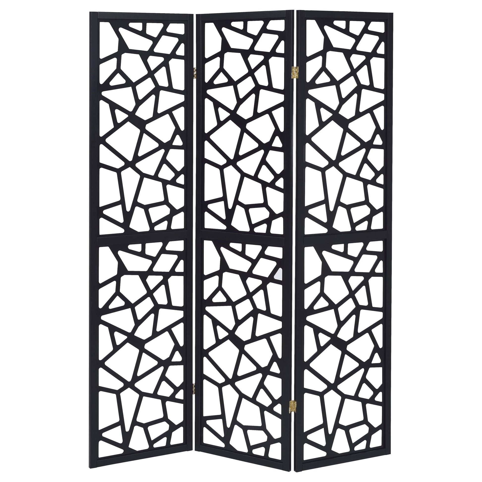 Make a bold statement in any space with this 3-panel room divider, featuring an eye-catching mosaic cutout pattern that enhances modern and mid-century décor. The sleek black finish creates a striking contrast, while the open geometric design allows light to pass through, maintaining an airy and spacious feel. Crafted with a durable solid wood frame, this partition is perfect for separating spaces, adding privacy, or serving as a decorative accent. Its folding trifold design offers versatility, making it easy to reposition as needed.