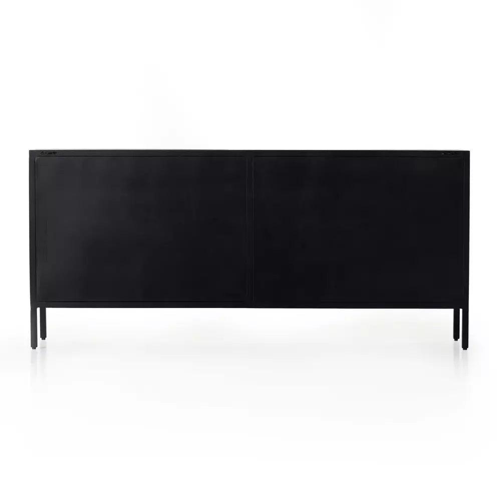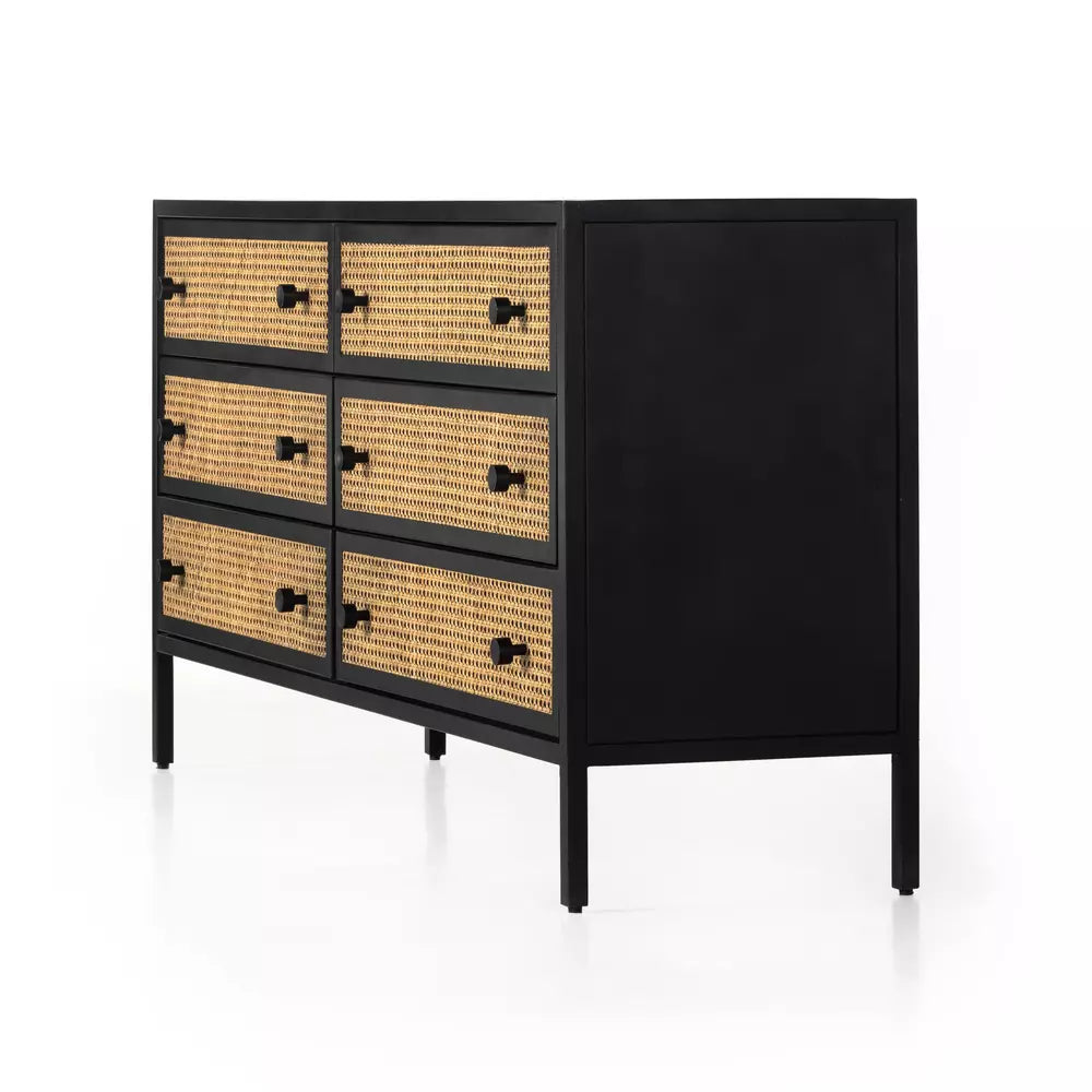 Make it modern with mixed materials. Black-finished iron encases six spacious drawers with natural cane fronts, for texture and contrast alike.