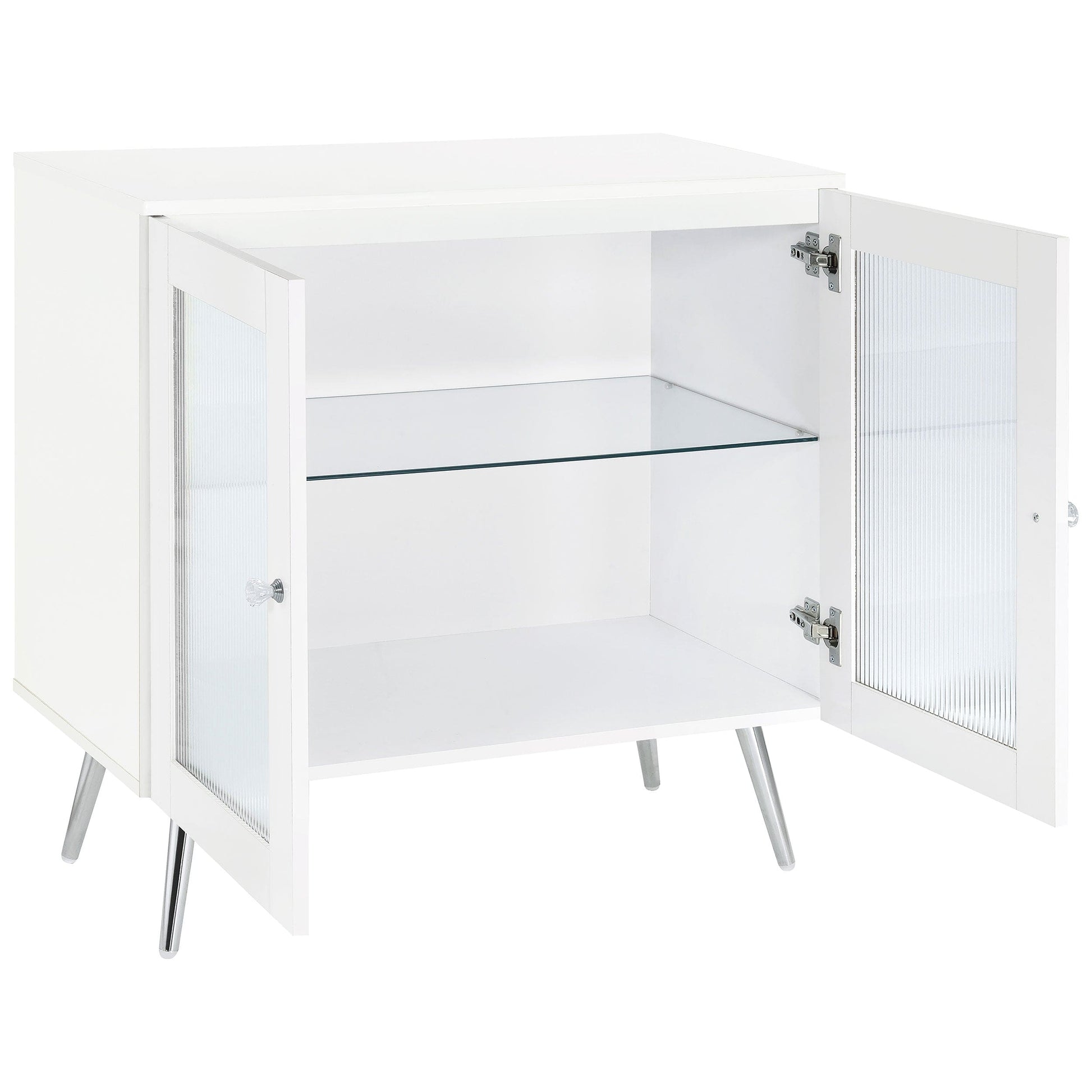 Step into a world where classic charm meets modern elegance with this 2-door accent cabinet. The crisp white finish on engineered wood construction is beautifully complemented by the textural contrast of rippled doors. Tapered steel legs, electroplated in chrome, give rise to two tiers of shelving, including a tempered glass shelf, all crowned with chic acrylic crystal knobs. This piece is not just a storage solution, but a statement that adds a touch of sophistication to any space.