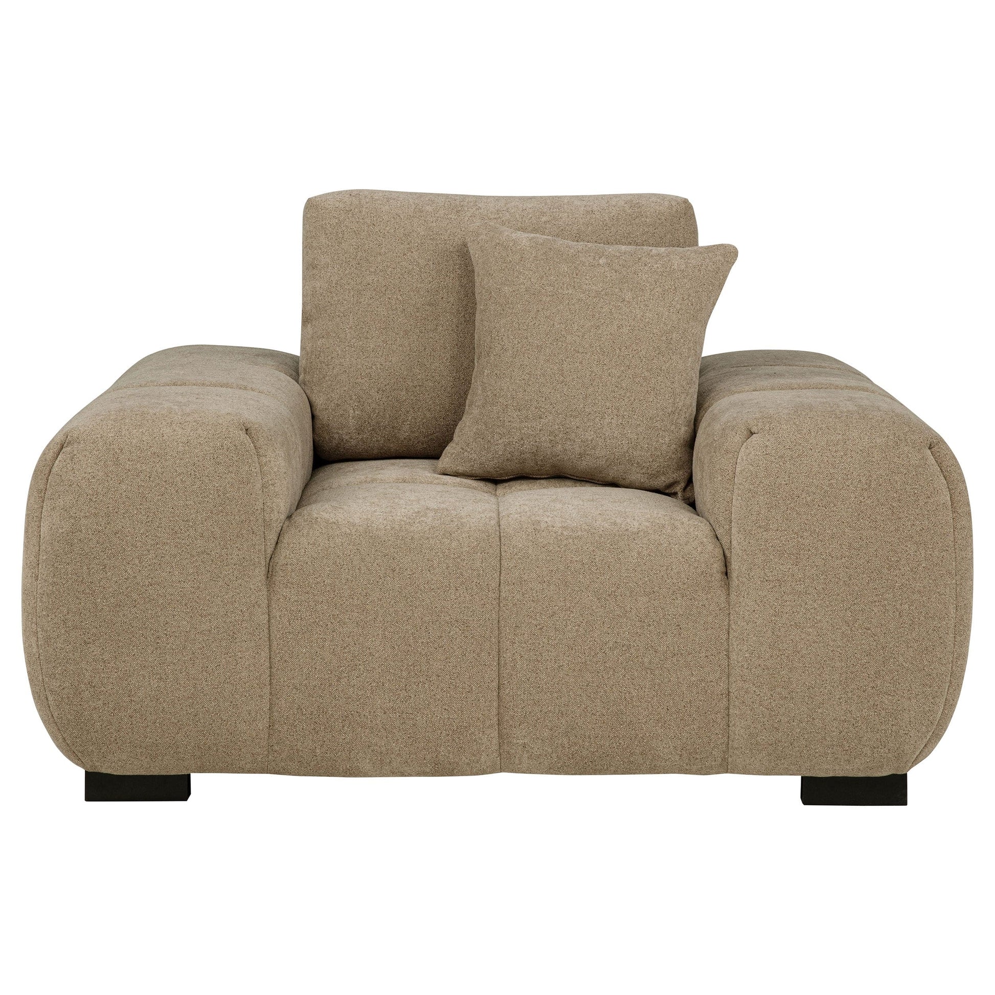• Accent chair in camel fabric features sculptural curves and deep vertical channel tufting
