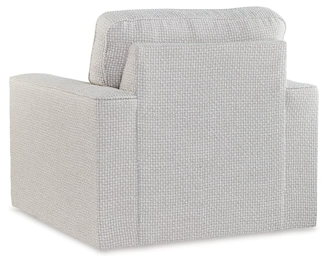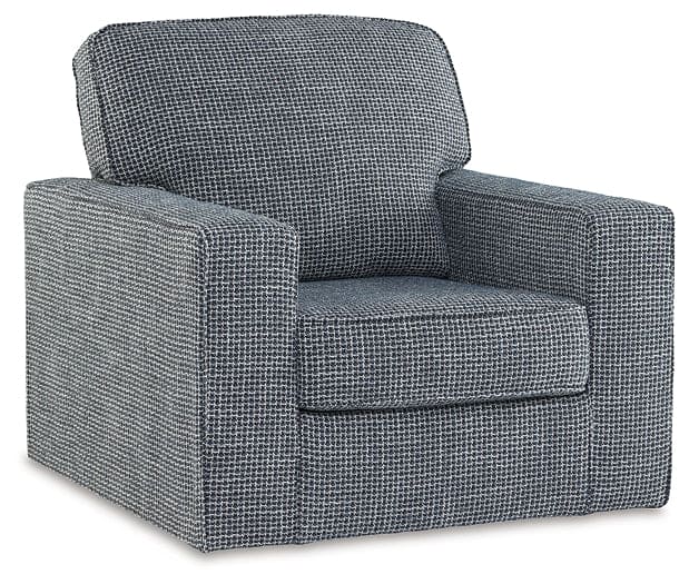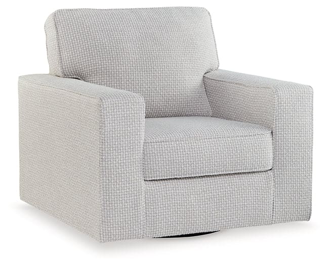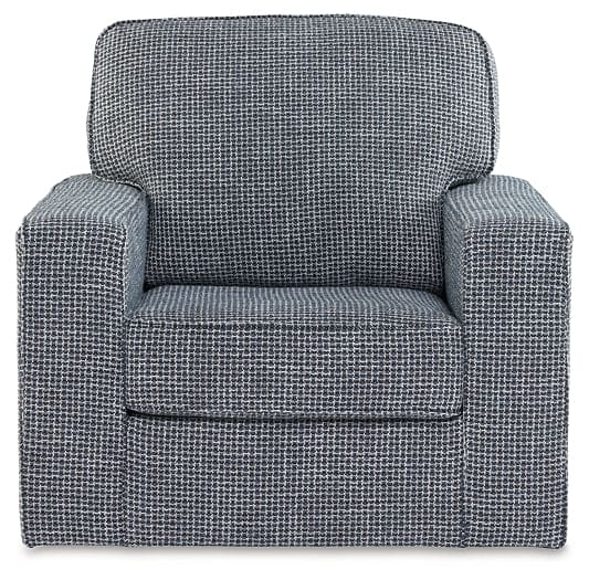 Details | Polyester upholstery, Attached back and loose seat cushion, Wide track arms, Metal swivel base, 360-degree swivel | |