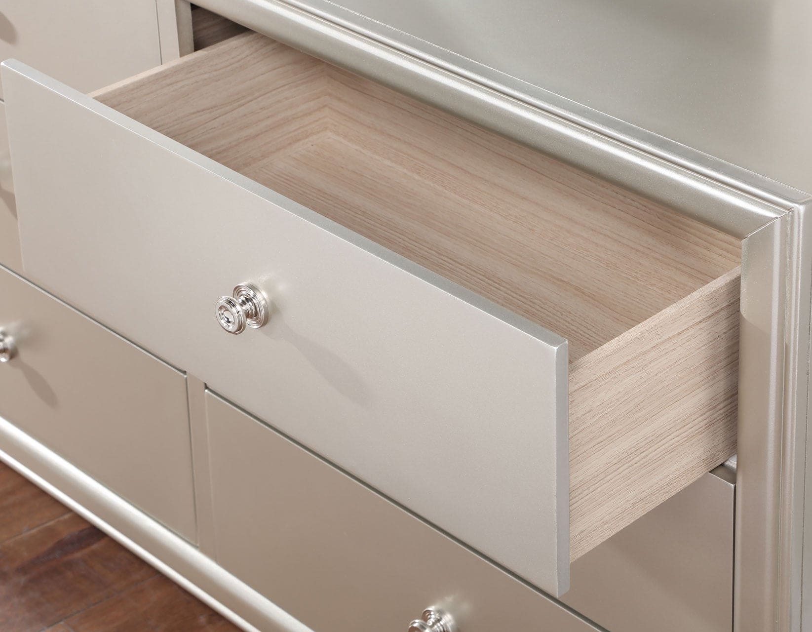 Bedroom storage in a stylish package, the Omni Chest dresses up a bedroom in glam style with this functional package. Five drawers offer ample room for clothes, including bulky items, in dazzling style with a champagne wood finish and nickel finished hardware.