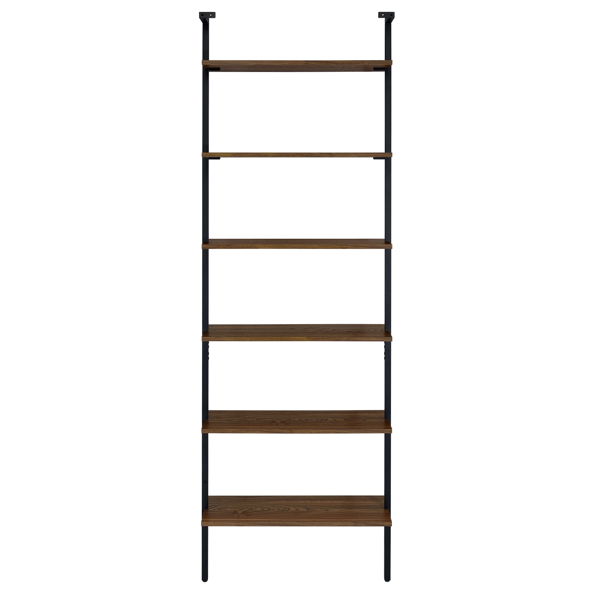 Curate your space to achieve a refined look and feel with this modern wall bookcase. Its elegant simplicity of silhouette brings light, airy ambiance in any space, maximizing space utilization without overwhelming. It features six open shelves in a walnut finish, each set within a black finish metal frame. The clean, chic lines of the frame attach to the wall at the top and drop to the floor, creating stability and minimalist appeal. Add a pair flanking your television for storage, or create a decorative vignette in a living or dining room.