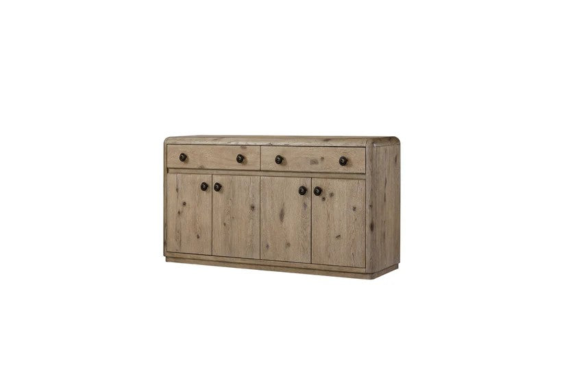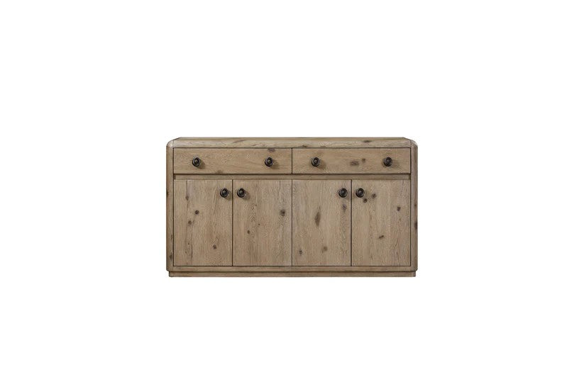 The Pagosa Server blends sculptural elegance with everyday function, crafted in richly grained oak for a warm, organic presence. Two spacious drawers and four doors reveal ample storage, thoughtfully designed to keep dining essentials tucked away yet close at hand. Black iron circular knobs add a subtle, refined contrast, grounding the piece with a modern edge. Softly curved corners echo the natural flow of the wood, offering a harmonious balance of form and utility. Perfect for entertaining or everyday use, the Pagosa Server is where craftsmanship meets quiet sophistication.