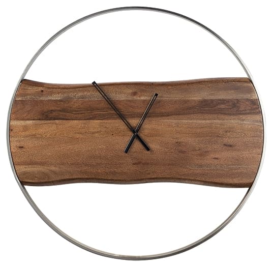 Time to simplify your style? This round wall clock is a mastery in minimalism. Its striking brown finished wood with silvertone finished frame and hands prove that less really is more—just two simple hands floating on a wooden plank. This streamlined clock is the ultimate designer piece for lovers of casual aesthetics.