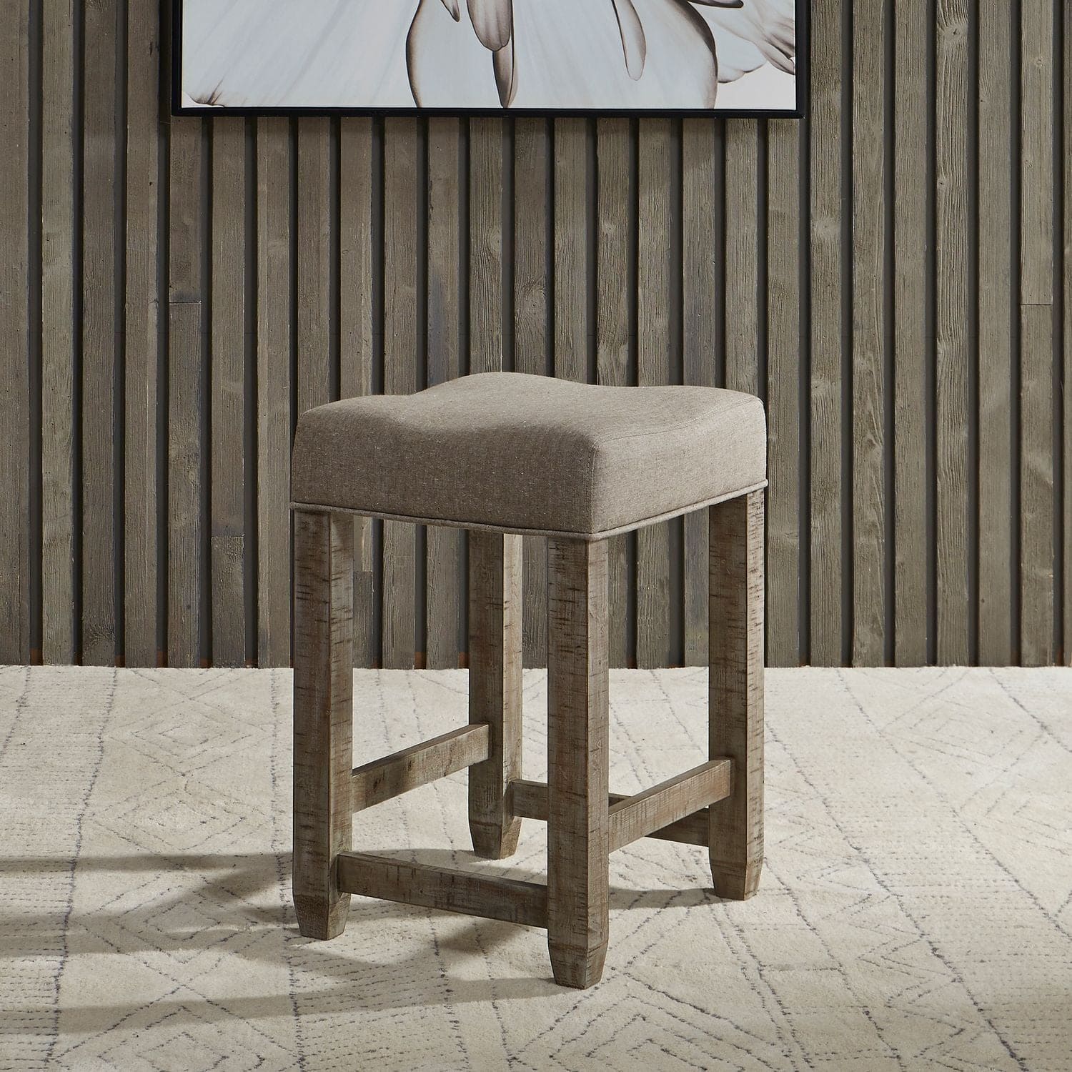 Parkland console stool features solid pine legs with glides to protect your floors. Features a cushioned upholstered seat in an Oatmeal color fabric. Fabric content 30% linen, 20% silk and 50% cotton.