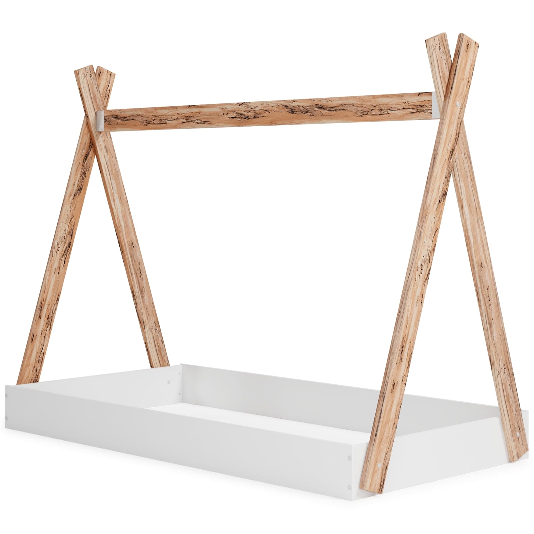 Adventure awaits with this twin tent complete bed in a box. The effortless blend of contemporary and casual styles creates an expressive two-tone look in matte white and replicated sugarberry wood grain pattern. This complete bed in a box requires no additional foundation, making it a functional, yet unique, addition to your home.
