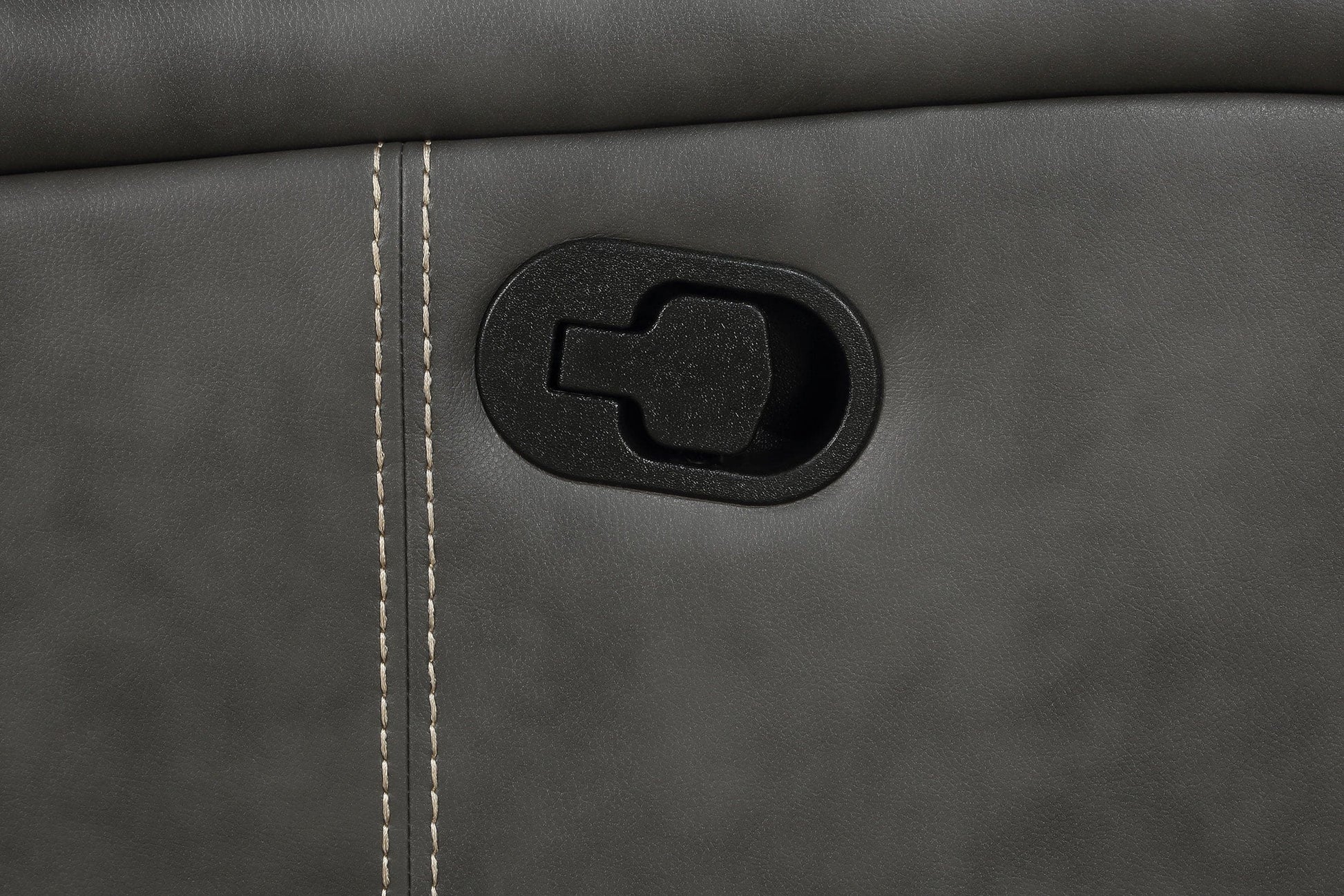• Recliner upholstered in smooth grey leatherette with vertical topstitch accents