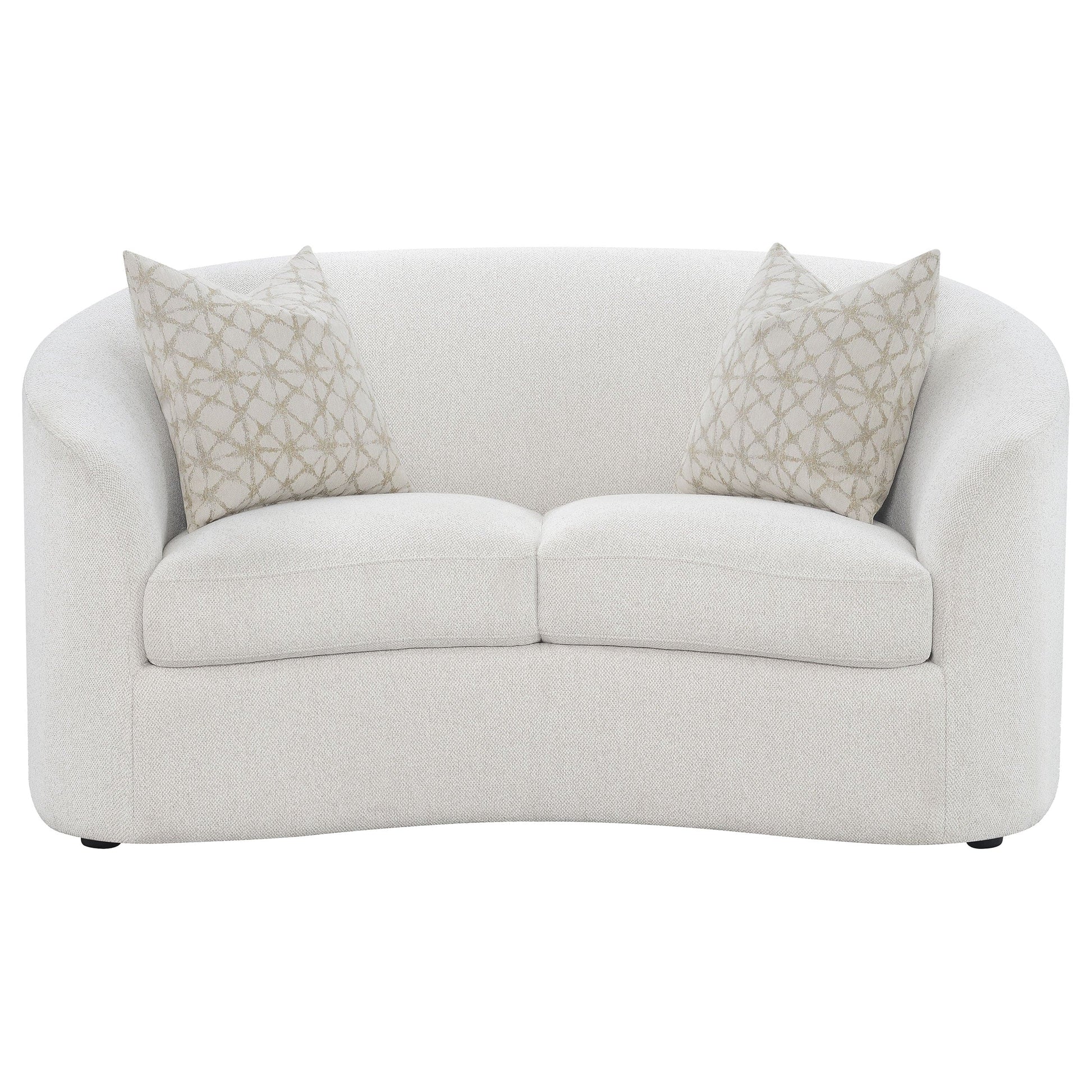 The living room set captures the perfect balance of modern warmth and sculptural design. Each piece is wrapped in soft latte boucle upholstery, creating a cozy yet elevated texture. Curved silhouettes and sloped armrests lend a contemporary feel, while plush cushions and tailored backs ensure enduring comfort. Accent pillows with faux down fill add inviting softness and refinement. Blending timeless craftsmanship with modern aesthetics, this collection transforms any living space into a serene and stylish retreat.
